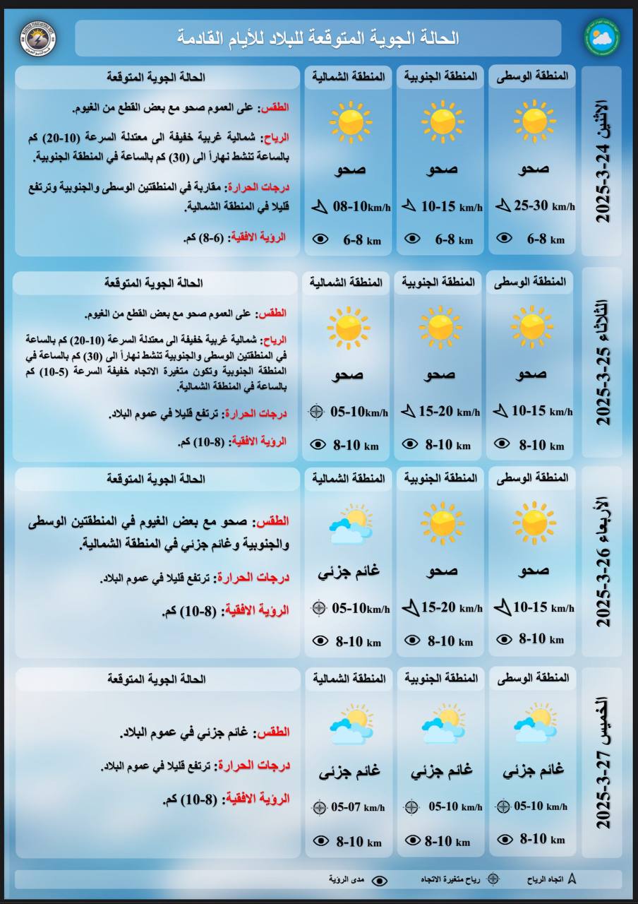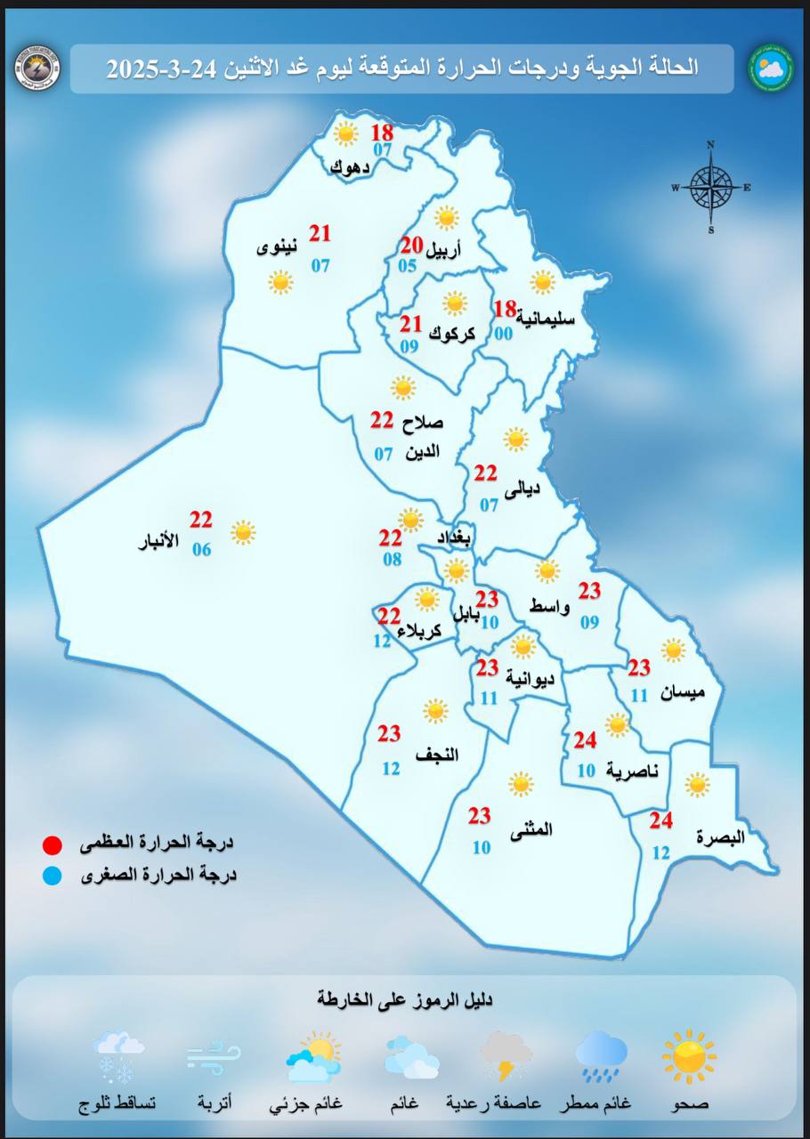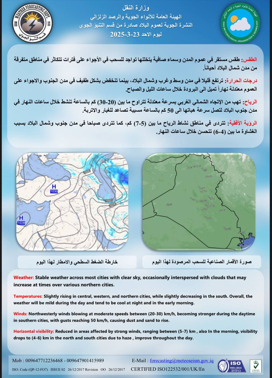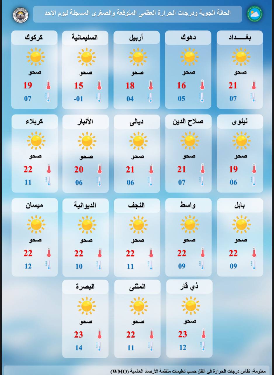 أعلنت هيئة الأنواء، اليوم الأحد، حالة طقس العراق خلال الأيام المقبلة، فيما أشارت إلى استقرار الأجواء في عموم المدن.