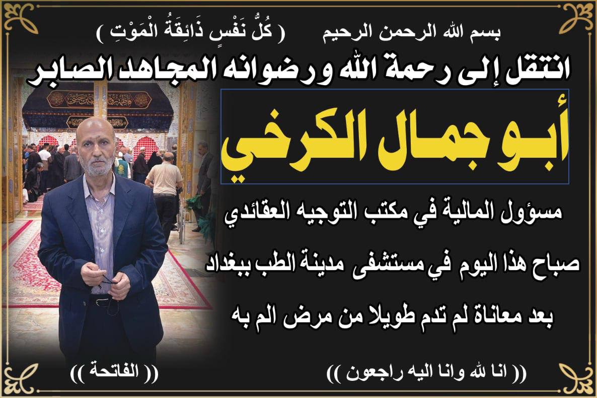 ودّعت منظمة بدر، صباح اليوم، المجاهد أبو جمال الكرخي، مسؤول المالية في مكتب التوجيه العقائدي، الذي وافته المنية بعد معاناة طويلة مع المرض.