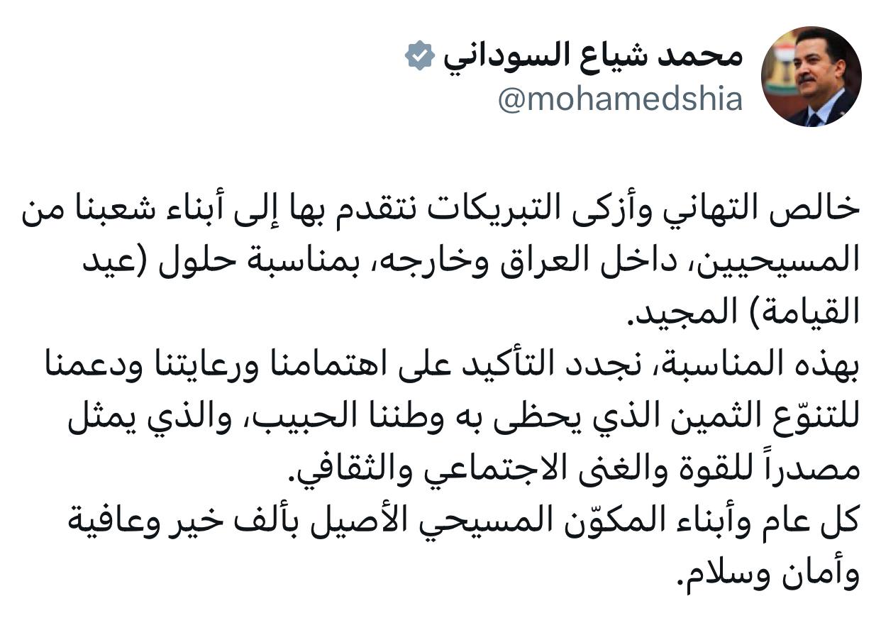 وقال رئيس الوزراء في تدوينة على منصة (X)، تلقتها ( الغدير) ، “خالص التهاني وأزكى التبريكات نتقدم بها إلى أبناء شعبنا من المسيحيين، داخل العراق وخارجه، بمناسبة حلول (عيد القيامة) المجيد”.