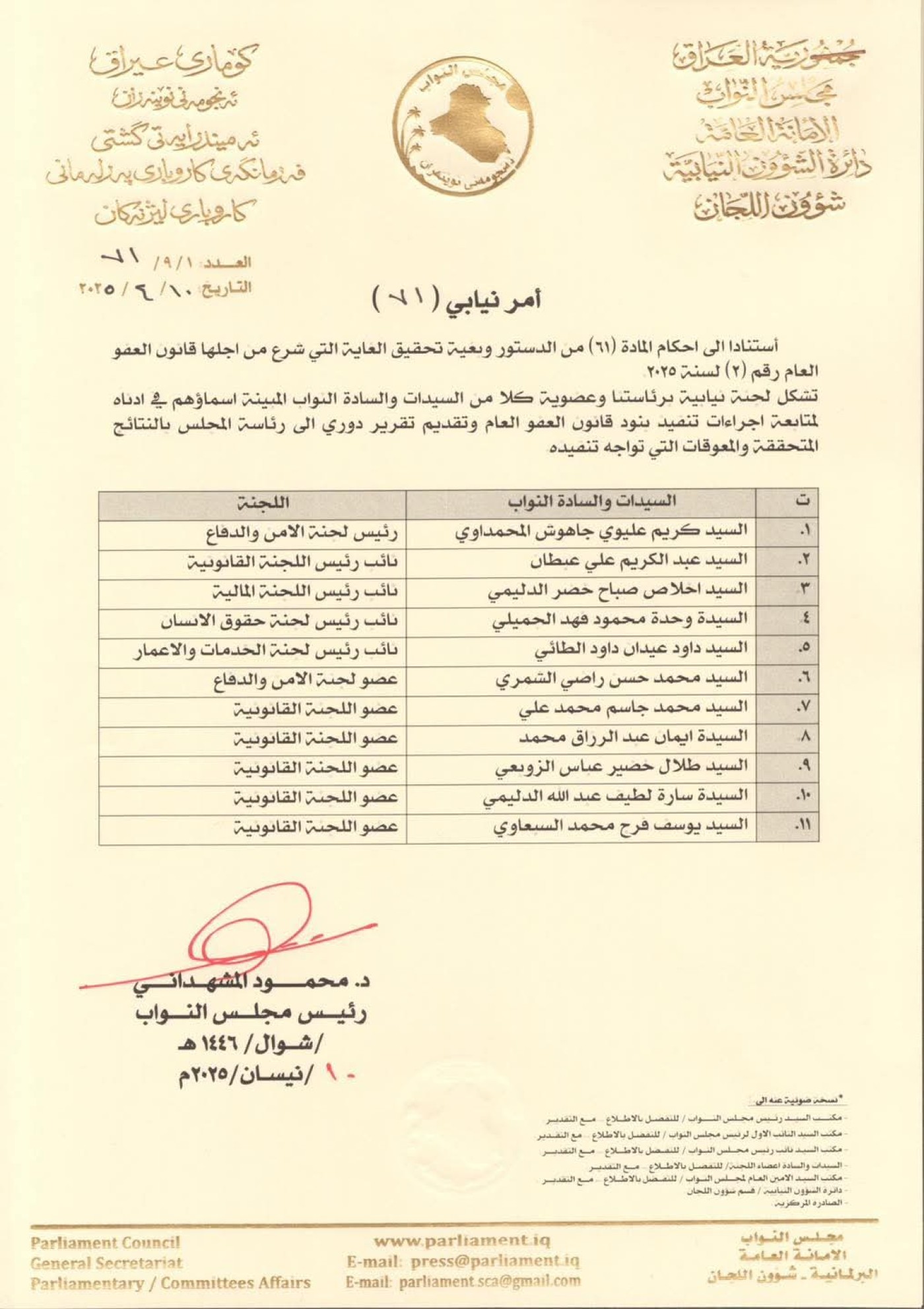 شكل مجلس النواب العراقي، برئاسة رئيس المجلس محمود المشهداني، لجنة خاصة لمتابعة تنفيذ قانون العفو العام.