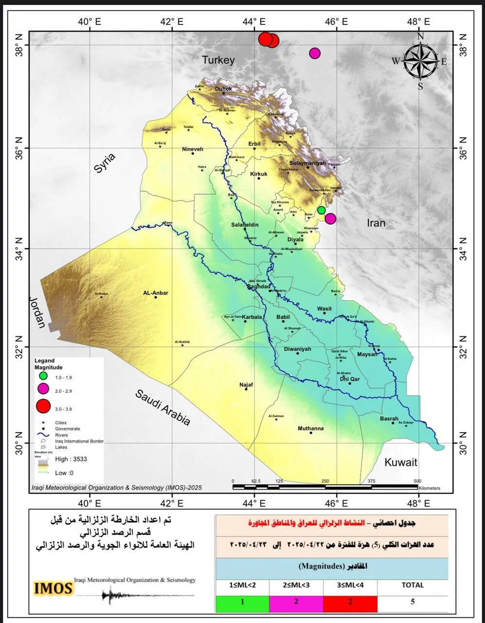أعلن قسم الرصد الزلزالي، اليوم الأربعاء، تسجيل 5 هزات أرضية في العراق.