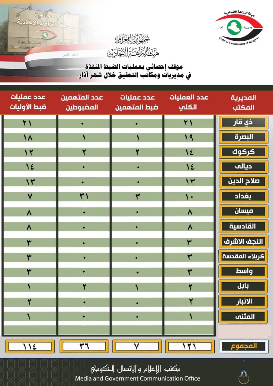 اعلنت هيئة النزاهة عن عمليات الضبط المنفذة من قبل مديريات الهيئة خلال شهر اذار الماضي . واوضحت في بيان :” ان عدد المتهمين المضبوطين بلغ 36 متهما ، من خلال 121 عملية ضبط شاركها Facebook Twitter Pinterest
