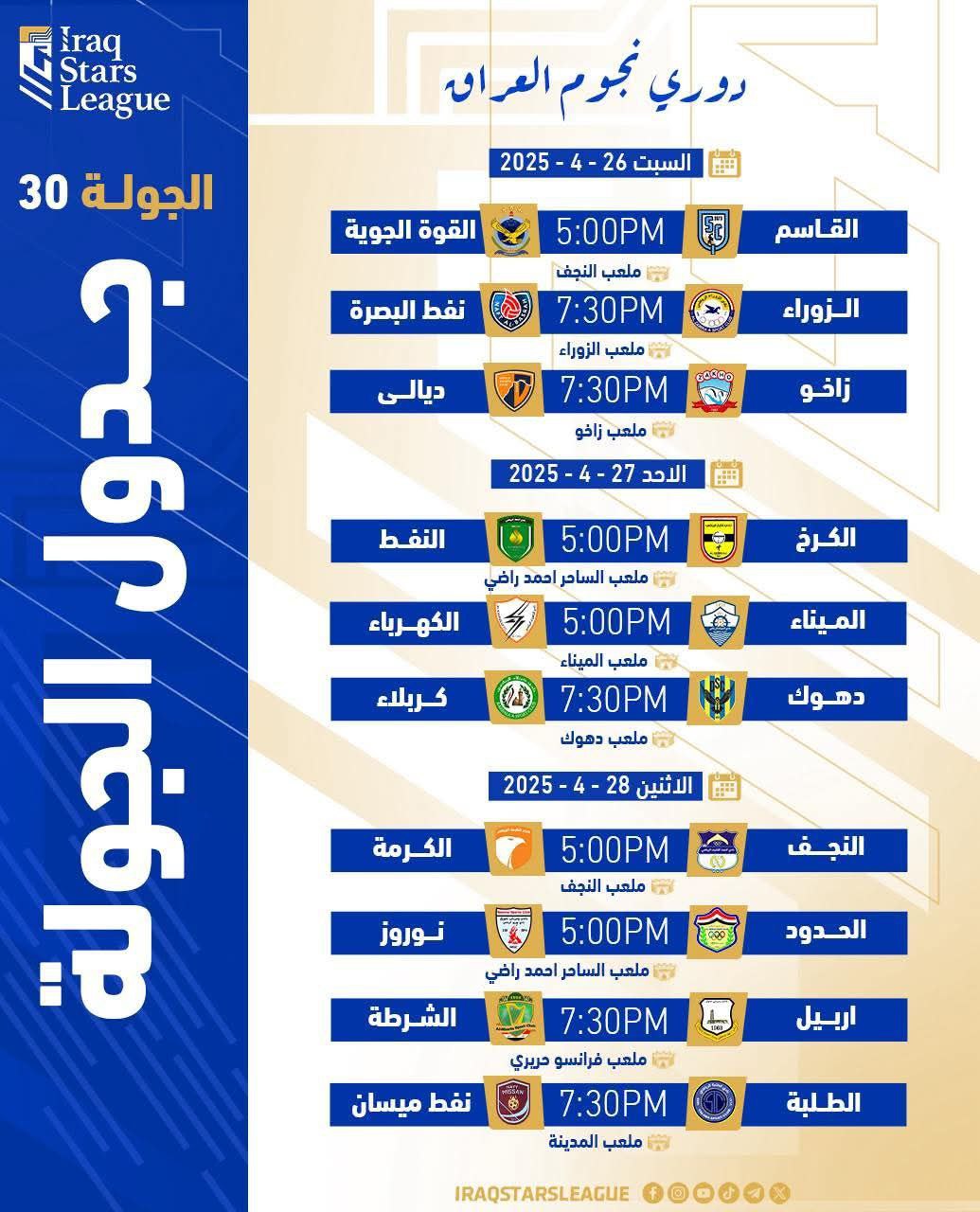 تنطلق يوم غد السبت مباريات الجولة الـ 30 بإقامة ثلاث مواجهات من دوري نجوم العراق.