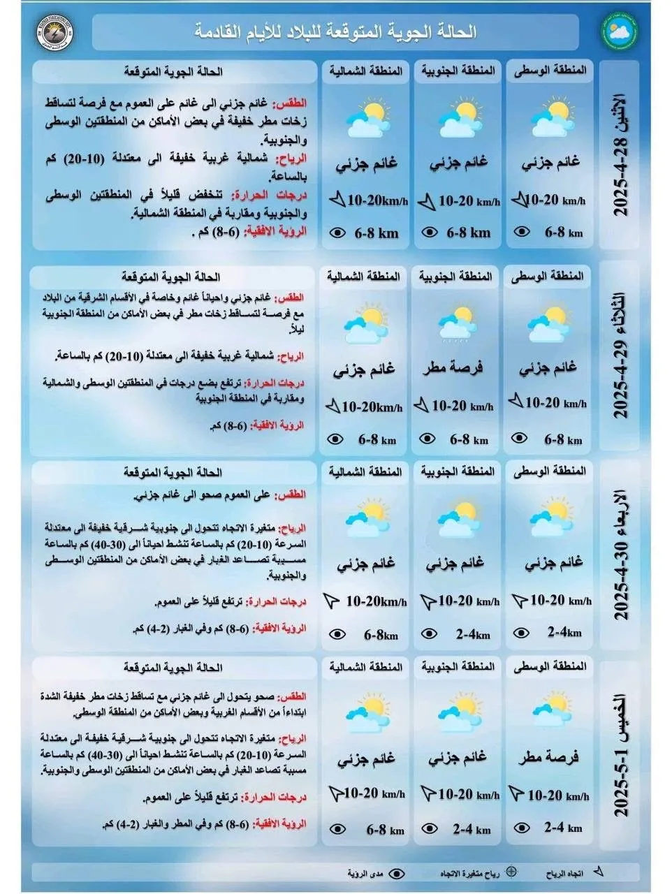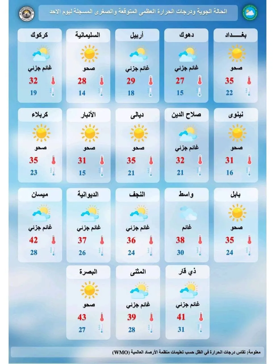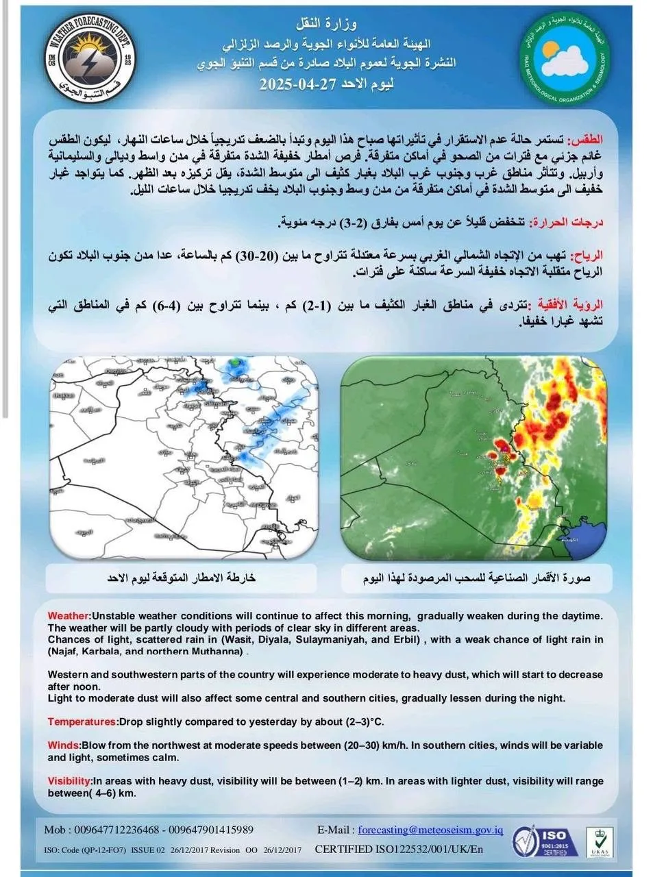 توقعت هيئة الأنواء الجوية، اليوم الأحد، بأن يكون طقس العراق ممطر مع غبار وانخفاض بالحرار. شاركها Facebook Twitter Pinterest