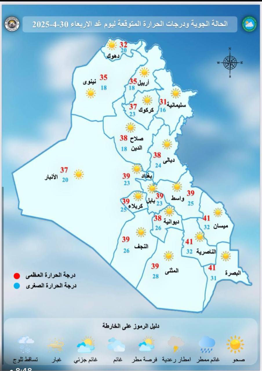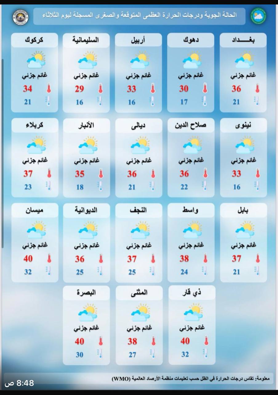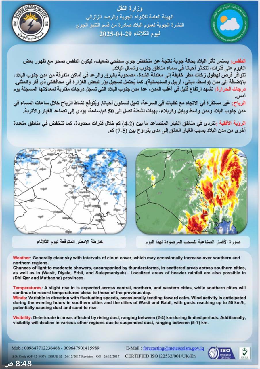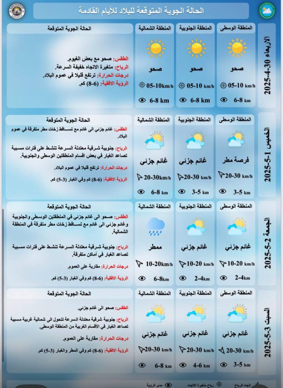 أعلنت هيئة الأنواء الجوية، اليوم الثلاثاء، عن تفاصيل حالة الطقس في البلاد للأيام المقبلة، فيما توقعت تساقطاً للأمطار وتصاعداً للغبار.