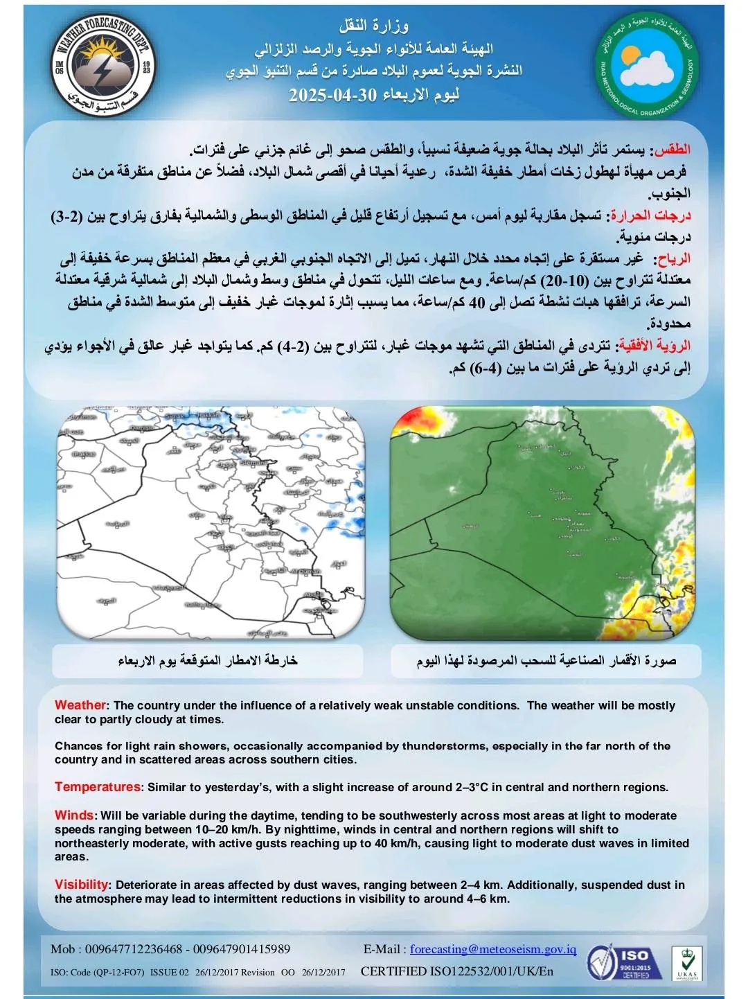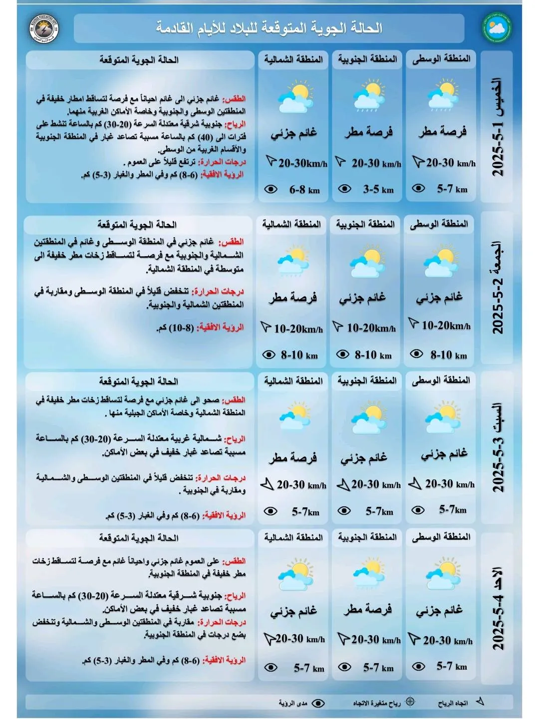 أعلنت هيئة الأنواء الجوية، اليوم الأربعاء، حالة طقس العراق خلال الأيام المقبلة، فيما أشارت إلى استمرار الأجواء المغبرة.
