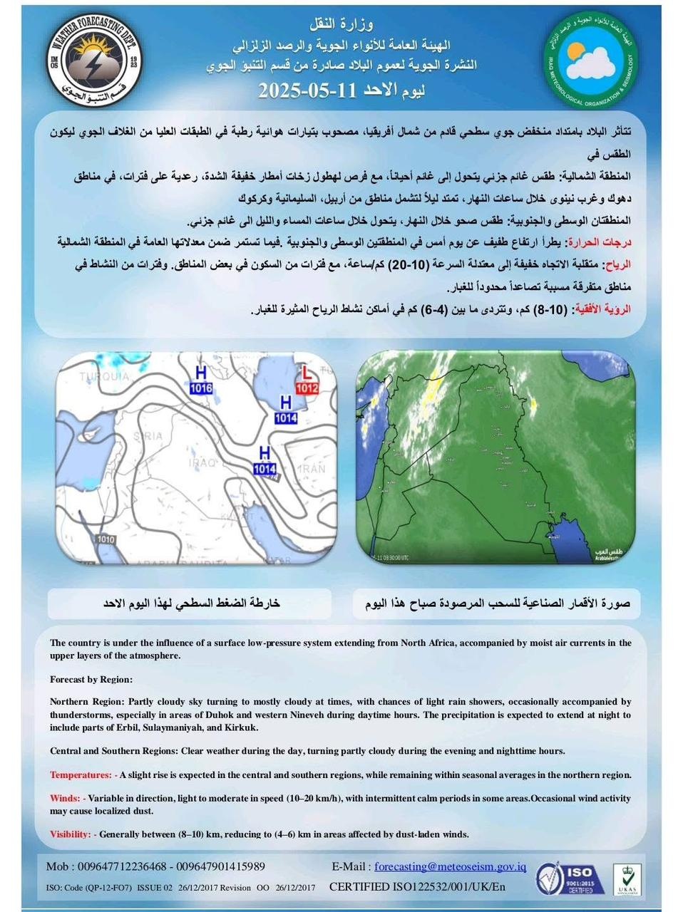 يشهد العراق، اليوم الأحد، تأثراً بامتداد منخفض جوي سطحي قادم من شمال أفريقيا، ترافقه تيارات هوائية رطبة في الطبقات العليا من الغلاف الجوي، ما يسبب تحسناً نسبياً في الأجواء شمال البلاد، في حين تبقى الأوضاع الجوية مستقرة في المنطقتين الوسطى والجنوبية دون تغييرات ملحوظة.
