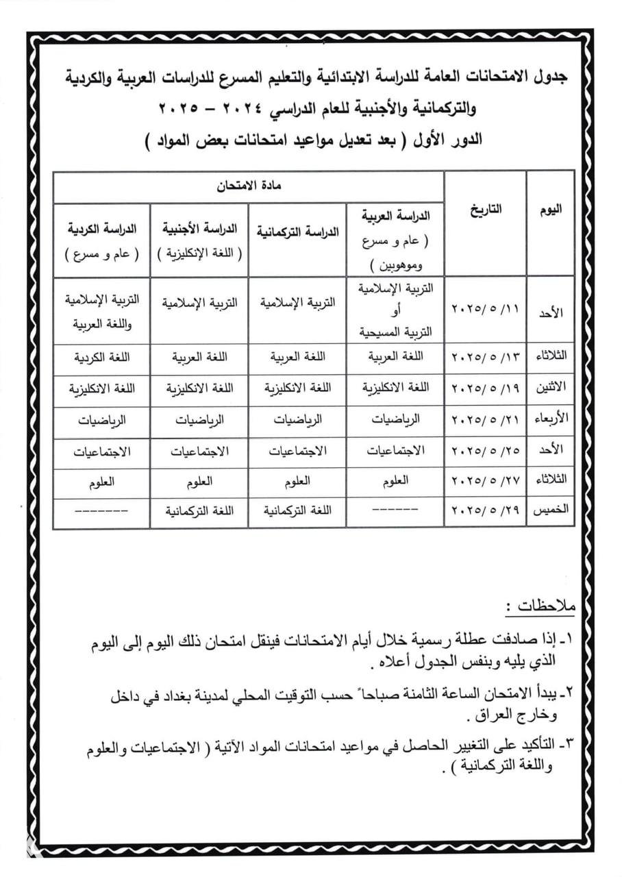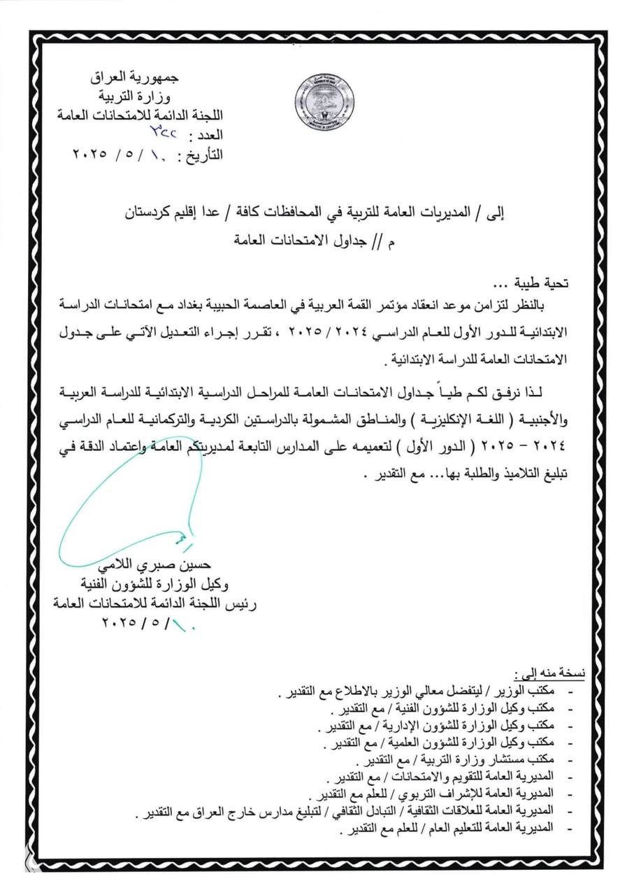 وفي سياق متصل، أعلنت الوزارة عن إجراء تعديل على جدول امتحانات المرحلة الابتدائية للدور الأول، وذلك نظراً لتزامن بعض مواعيد الامتحانات مع انعقاد مؤتمر القمة العربية في العاصمة بغداد.