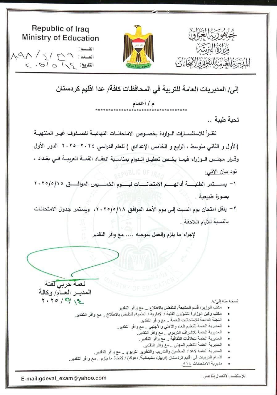 اكدت وزارة التربية، اليوم الاربعاء، استمرار الامتحانات النهائية للمراحل غير المنتهية/ الدور الاول للصفوف (الاول والثاني المتوسط والرابع والخامس الإعدادي) يومي الخميس والأحد على أن يكون التعطيل يوم السبت المقبل فقط بحسب ما ذكرت الوزارة في الموثيقة ادناه: