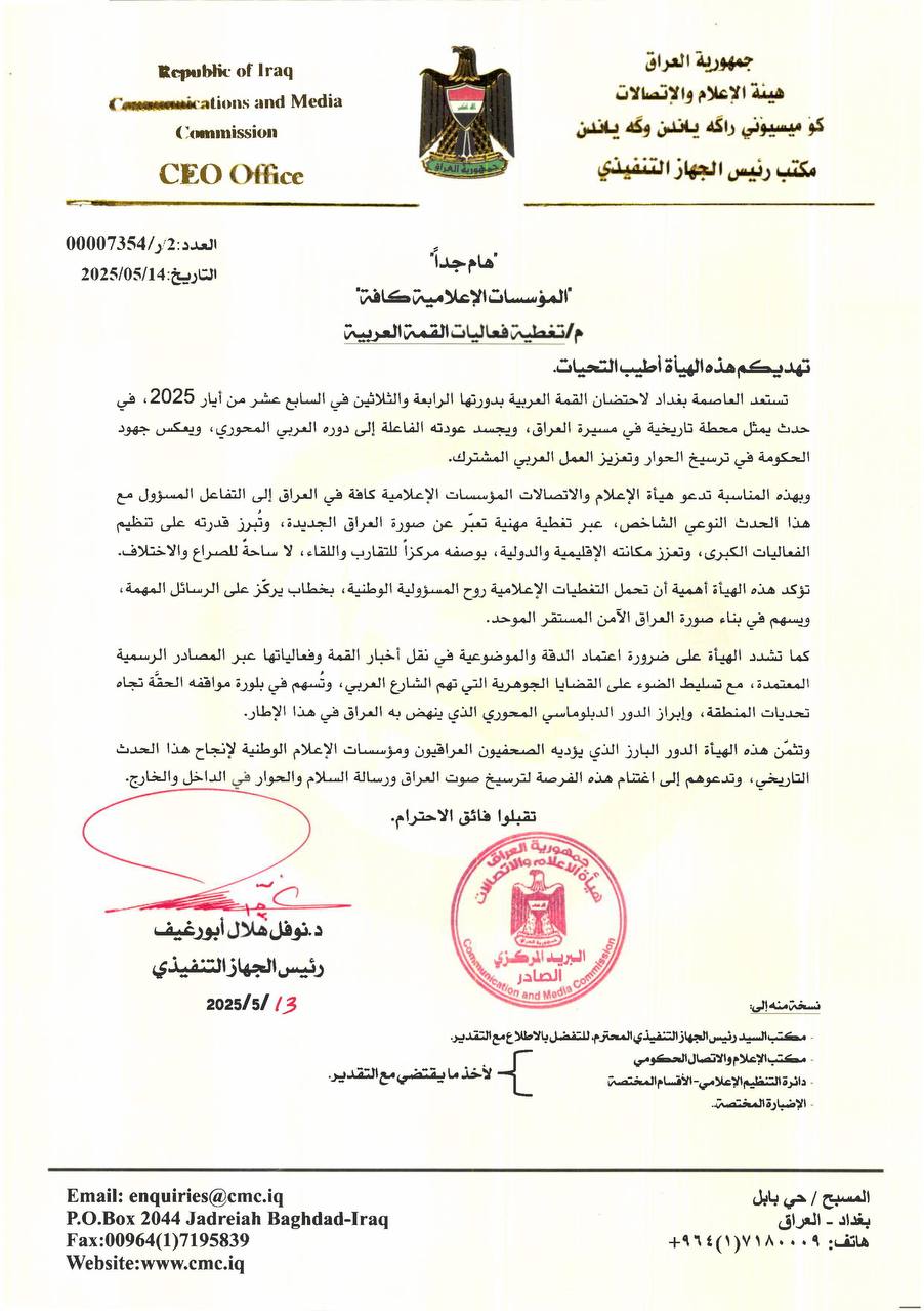 كما شددت الهيئة على ضرورة اعتماد الدقة والموضوعية في نقل أخبار القمة وفعالياتها عبر المصادر الرسمية المعتمدة، مع تسليط الضوء على القضايا الجوهرية التي تهم الشارع العربي، وتُسهم في بلورة مواقفه الحقة تجاه تحديات المنطقة، وإبراز الدور الدبلوماسي المحوري الذي ينهض به العراق في هذا الإطار.