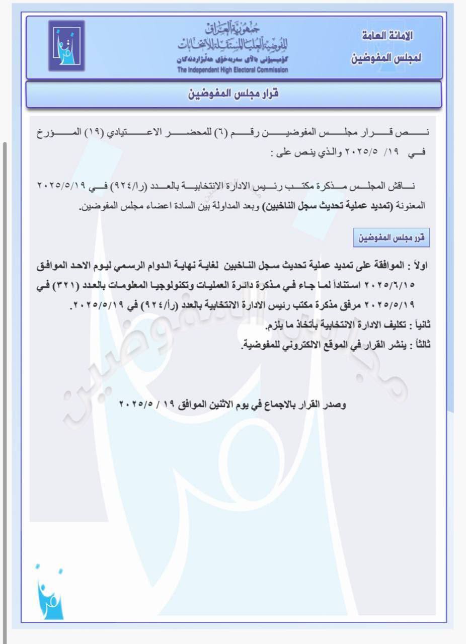 أولاً : الموافقة على تمديد عملية تحديث سجل الناخبين لغاية نهاية الدوام الرسمي ليوم الأحد الموافق 2025/6/15.