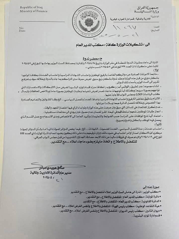 أصدرت وزارة المالية توجيهات جديدة لمختلف تشكيلاتها ومكاتبها، تهدف إلى معالجة مظالم الموظفين واحتساب الشهادات والخدمات، مشددة على ضرورة الالتزام بمعايير الوظيفة العامة والنزاهة الإدارية.