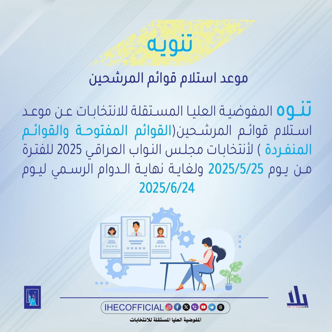 وذكرت المفوضية في بيان تلقته “الغدير”، أن “موعد استلام قوائم المرشحين، القوائم المفتوحة والقوائم المنفردة (لانتخابات مجلس النواب العراقي 2025 للفترة من يوم 2025/5/25 ولغاية نهاية الدوام الرسمي ليوم 2025/6/24”.