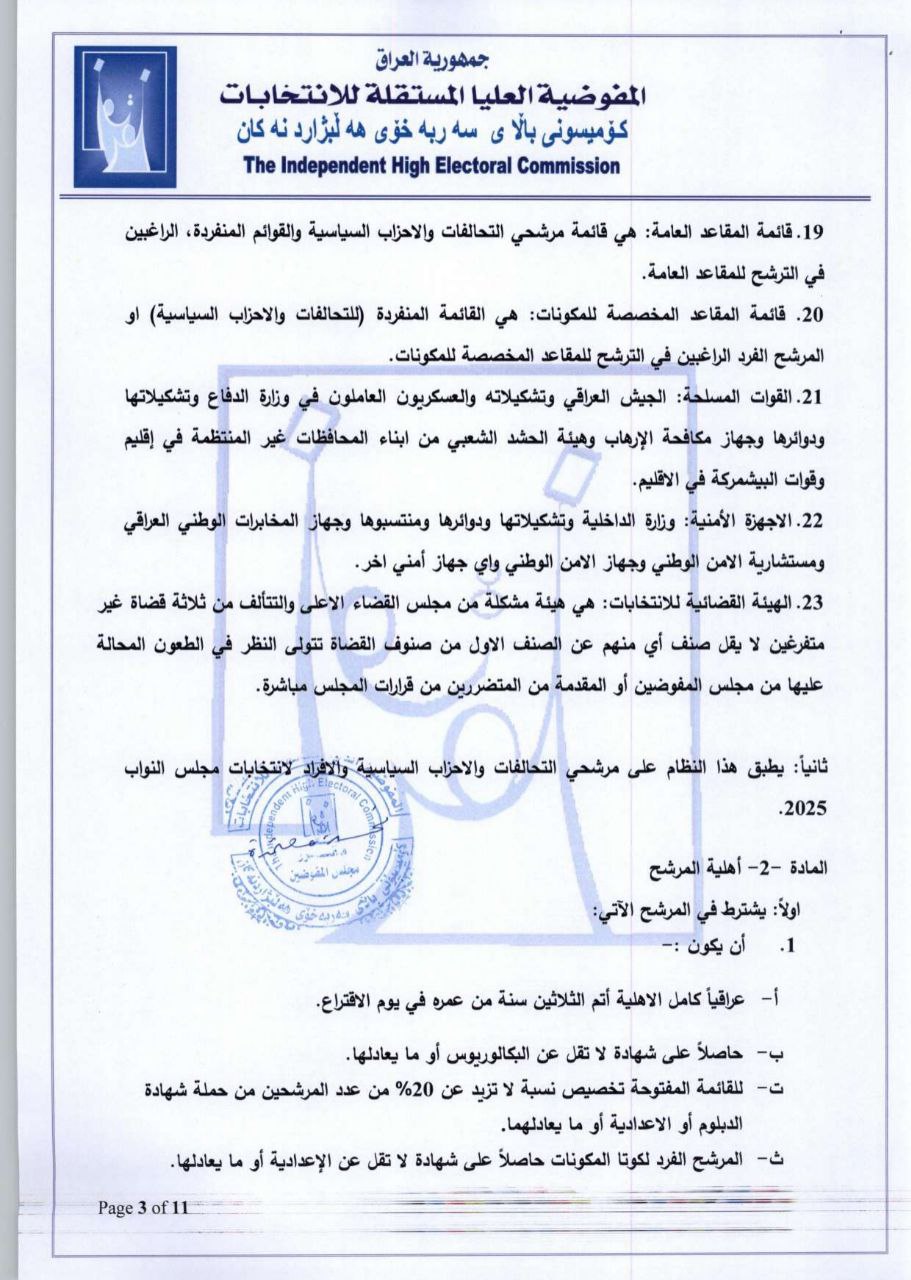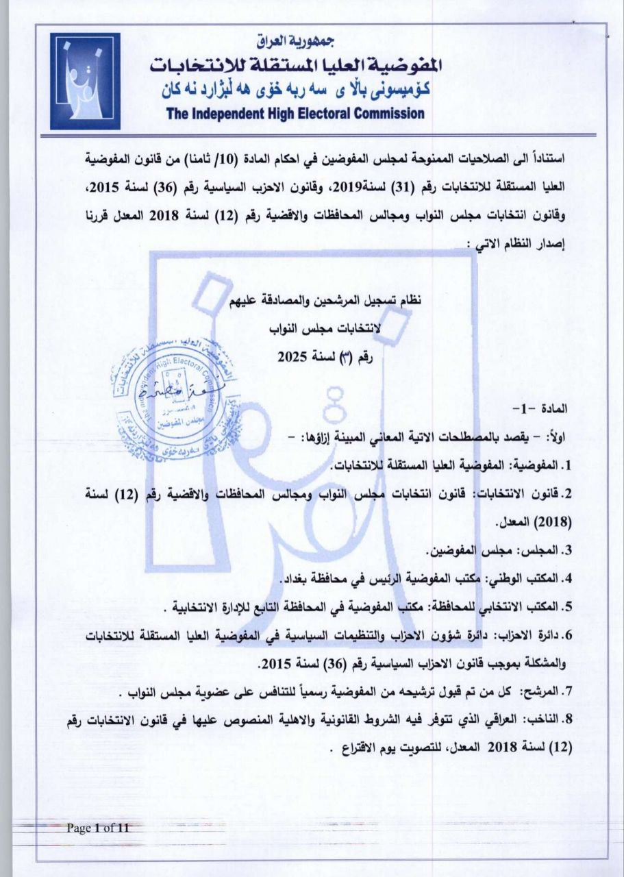 ووفقاً لوثائق صادرة عن المفوضية، فإن النظام الجديد يحدد الآليات والإجراءات اللازمة لتقديم طلبات الترشيح والوثائق المطلوبة، مؤكدة أن نظام تسجيل المرشحين والمصادقة عليهم لانتخابات مجلس النواب سيكون ضمن قانون رقم 3 لسنة 2025.