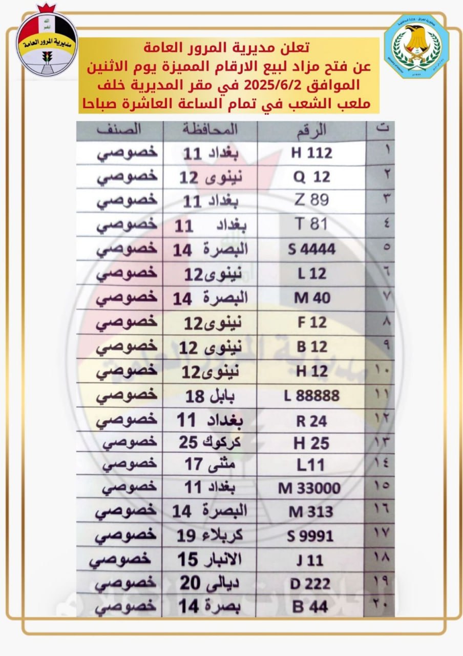 أعلنت مديرية المرور العامة، الأربعاء، عن موعد إقامة مزاد علني لبيع الأرقام المرورية المميزة، وذلك يوم الاثنين الموافق 2 حزيران 2025، في مقر المديرية الكائن خلف ملعب الشعب، على أن ينطلق المزاد في تمام الساعة العاشرة صباحاً.