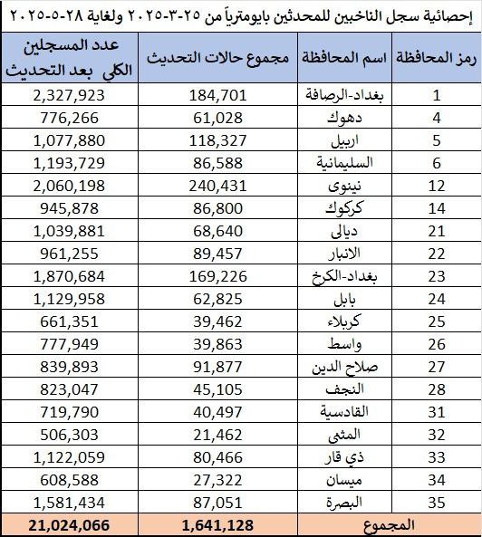 وذكر بيان للمفوضية، تلقته ( الغدير)، أن ” عدد المسجلين بايومترياً بلغ 066. 21.024 ناخب”.