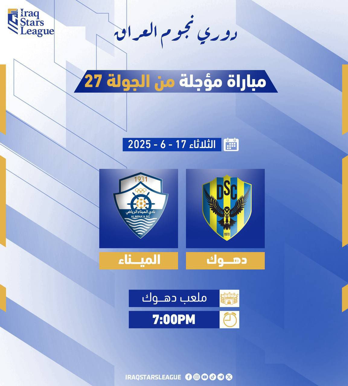 ‏وستقام مباراة فريق دهوك وضيفه فريق الميناء ضمن منافسات الجولة 27 لدوري نجوم العراق لكرة القدم، يوم الثلاثاء 17 من شهر حزيران يونيو الجاري، عند الساعة السابعة مساءً على ملعب دهوك.