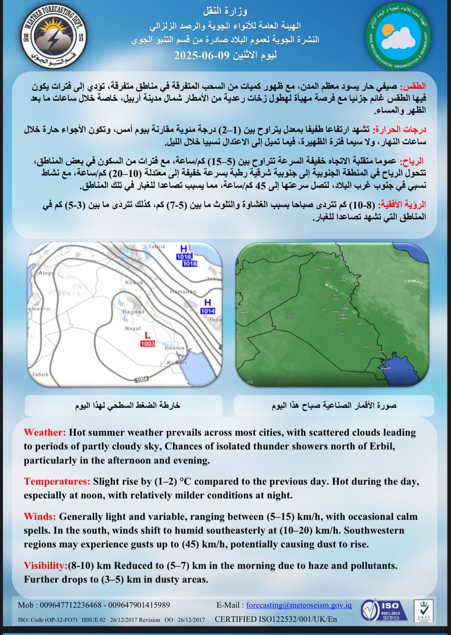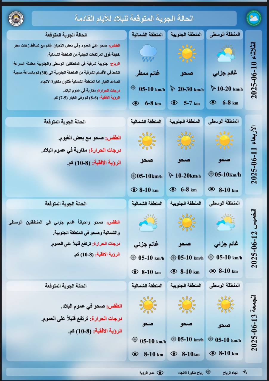توقعت هيئة الأنواء الجوية، استمرار ارتفاع درجات الحرارة بالعراق لتتجاوز الأربعين. شاركها Facebook Twitter Pinterest