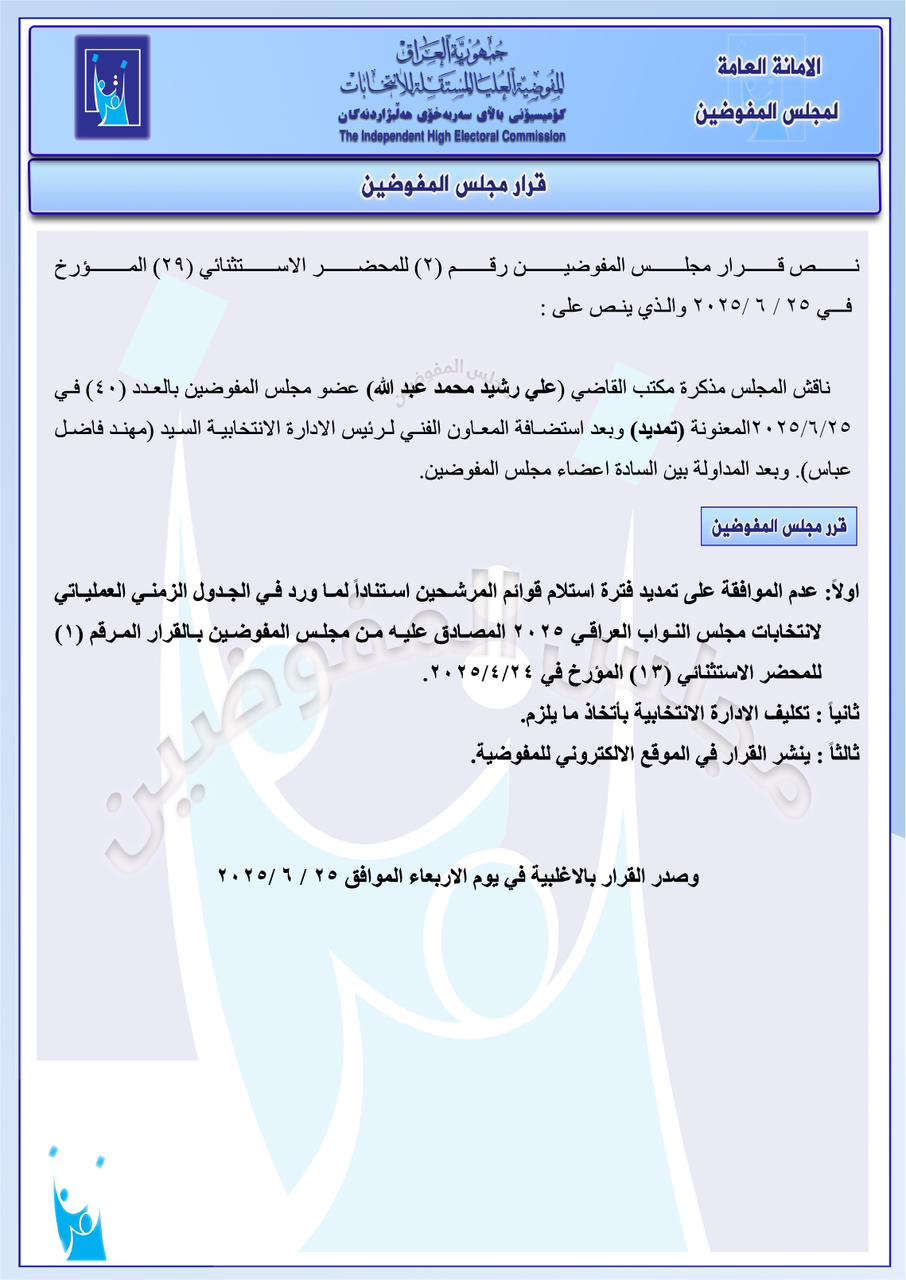 أعلنت مفوضية الانتخابات، اليوم الأربعاء، عدم الموافقة على تمديد فترة تسلم قوائم المرشحين للانتخابات البرلمانية المقبلة.