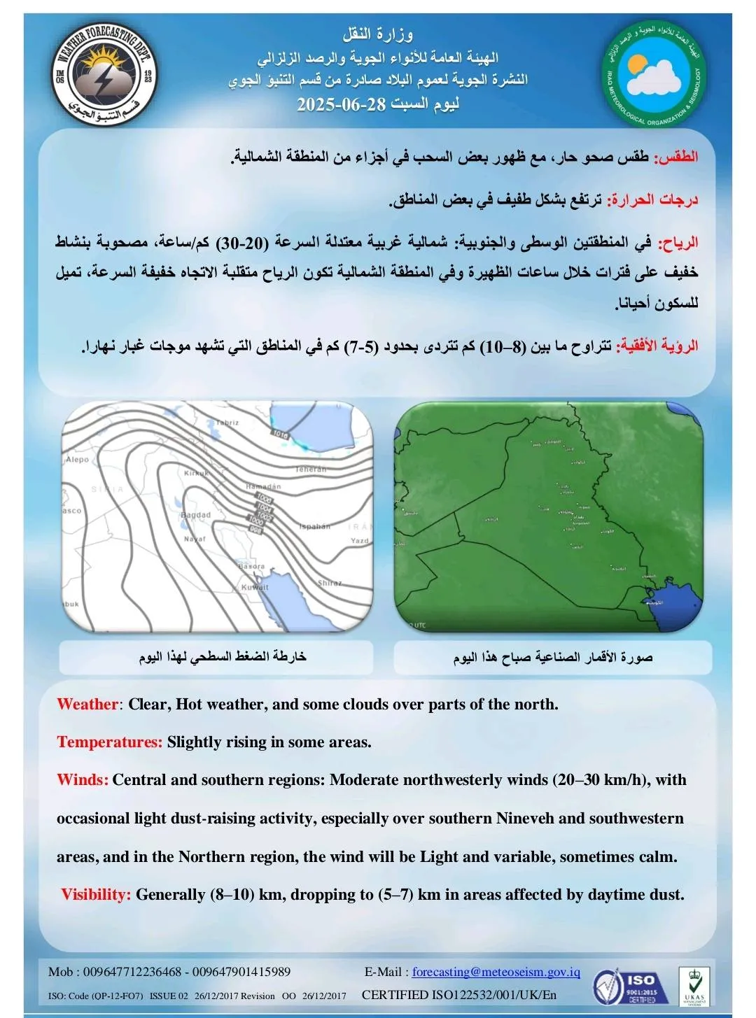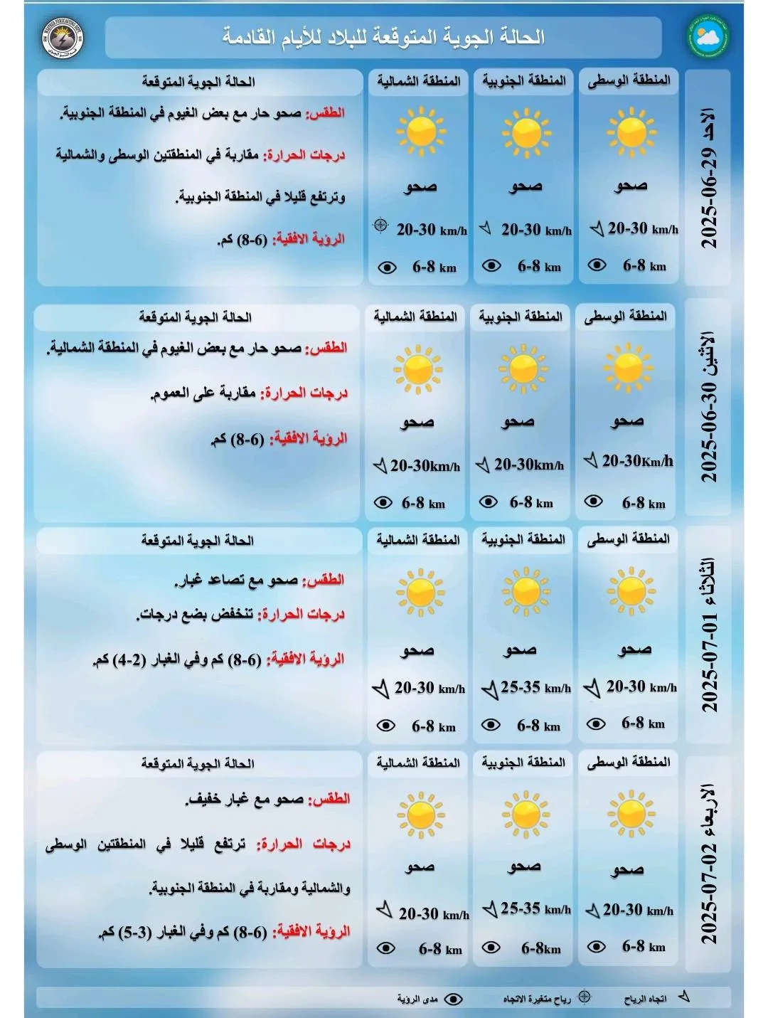 أعلنت هيئة الأنواء الجوية، اليوم السبت، حالة طقس العراق خلال الأيام المقبلةـ فيما أشارت إلى محافظات تسجل نصف درجة الغليان وأخرى تقترب منها. شاركها Facebook Twitter Pinterest