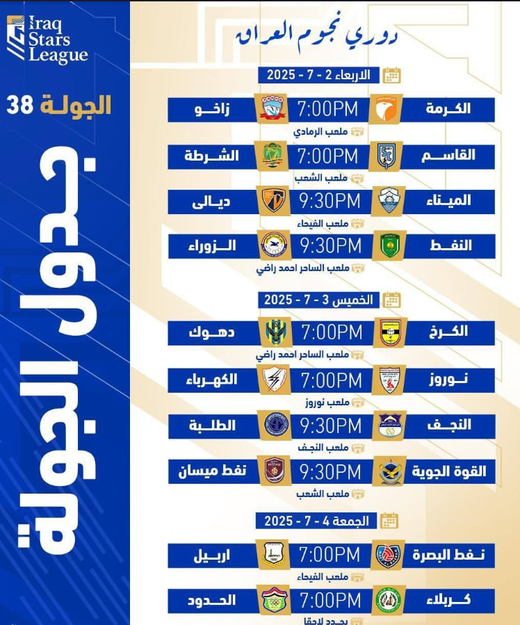 وفي ما يلي جدول مباريات الجولة الـ 38من دوري نجوم العراق: