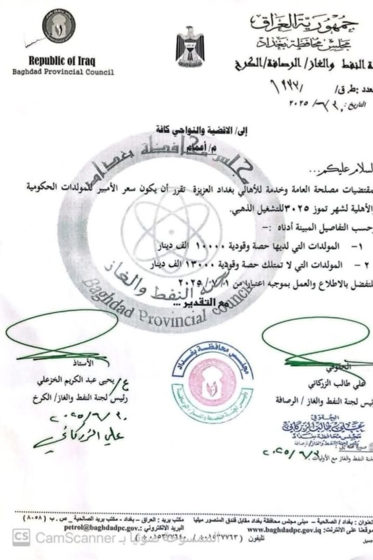 محافظة بغداد تحدد سعر الأمبير للمولدات ( وثيــــقة)