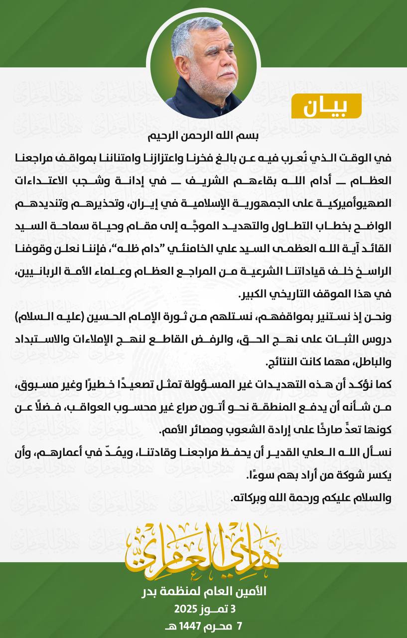وقال العامري في بيان تابعته ( الغدير) ،  ندين بشدة الاعتداءات الصهيواميركية على الجمهورية الإسلامية الإيرانية في الوقت الذي نُعرب عن بالغ فخرنا واعتزازنا وامتناننا بمواقف مراجعنا العظام ــ أدام الله بقاءهم الشريف ــ في إدانة وشجب الاعتداءات الصهيوأميركية على الجمهورية الإسلامية في إيران، وتحذيرهم وتنديدهم الواضح بخطاب التطاول والتهديد الموجَّه إلى مقام وحياة سماحة السيد القائد آية الله العظمى السيد علي الخامنئي “دام ظله”، فإننا نعلن وقوفنا الراسخ خلف قياداتنا الشرعية من المراجع العظام وعلماء الأمة الربانيين، في هذا الموقف التاريخي الكبير.