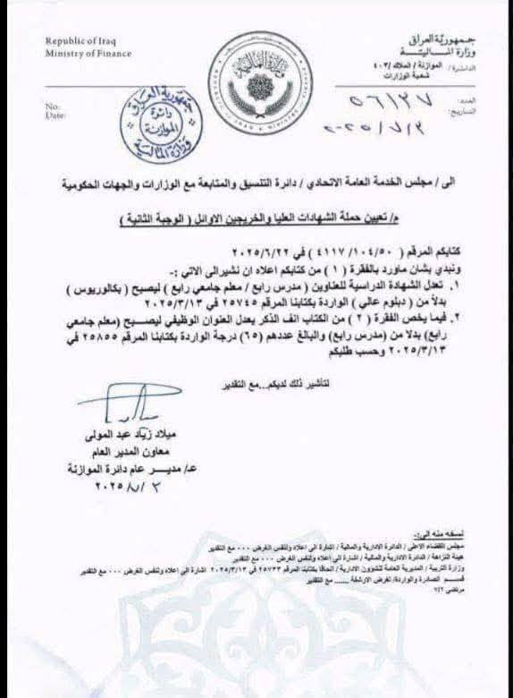 كشفت وزارة المالية موافقتها على كتاب ( منسوب ) لمجلس الخدمة الاتحادي بخصوص تعديل وتصحيح العناوين الوظيفية للمعينين على وزارة التربية من حملة شهادتي الدبلوم العالي والبكالوريوس.