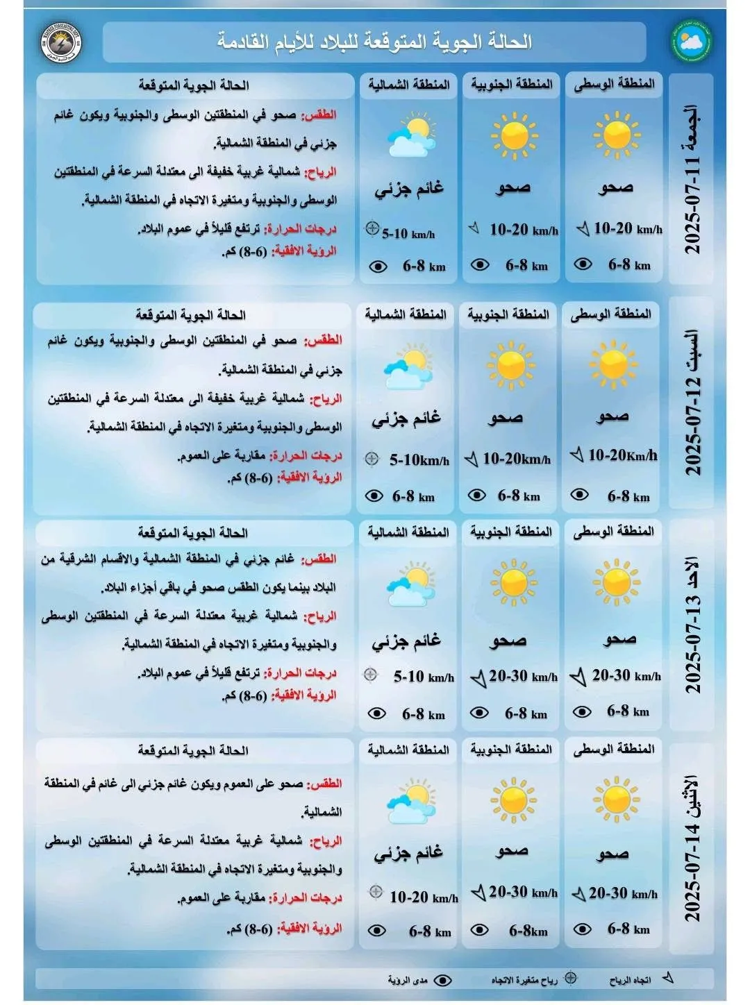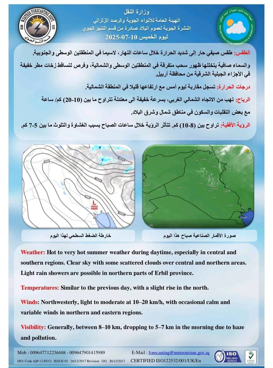 توقعت هيئة الأنواء الجوية، اليوم الخميس، ارتفاعاً جديداً بدرجات الحرارة في العراق. شاركها Facebook Twitter Pinterest