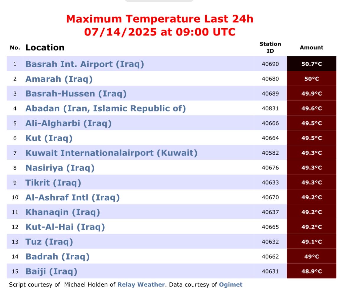 وأشار الجدول، إلى أن منطقة مطار البصرة الدولي في العراق سجلت أعلى درجة حرارة بالعالم، بواقع 50.7 درجة مئوية، تليها بالمرتبة الثانية العمارة في العراق بواقع 50 درجة مئوية، وجاء في المرتبة الثالثة مدينة البصرة الحسين في العراق، بواقع 49.9 درجة مئوية، من ثم عبادان في إيران رابعاً وبواقع 49.6 درجة مئوية، في حين جاءت علي الغربي في العراق خامساً بدرجة حرارة بلغت 49.5 درجة مئوية.