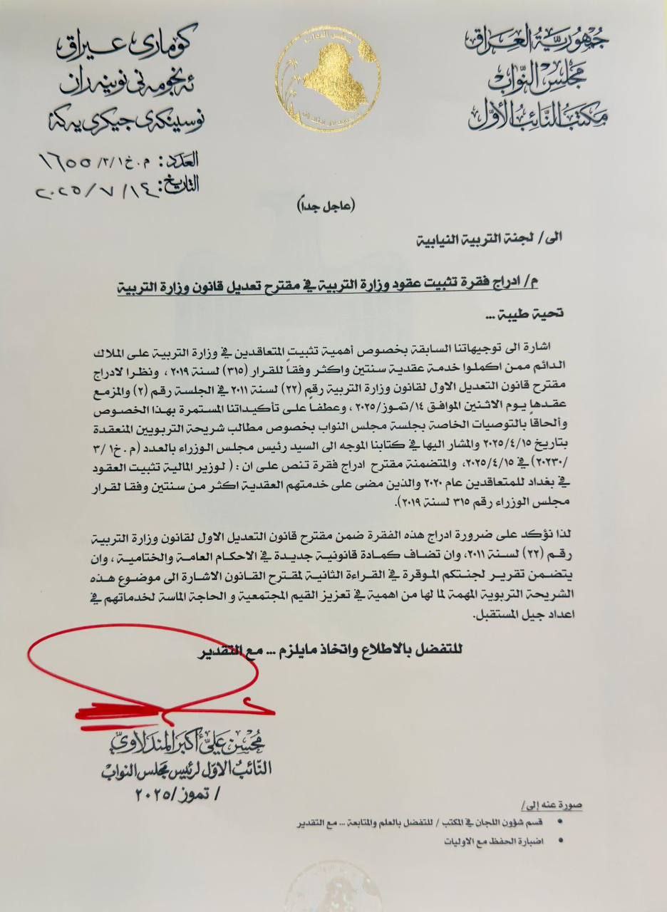وقال المندلاوي: “وجهنا بإدراج فقرة تثبيت عقود وزارة التربية على الملاك الدائم ممن اكملوا خدمة عقدية سنتين واكثر وفق القرار (315) لسنة 2019، في مقترح قانون التعديل الأول لقانون وزارة التربية رقم (22) لسنة 2011، والذي تم ادراجه للمناقشة في جدول اعمال جلسة هذا اليوم الاثنين”.