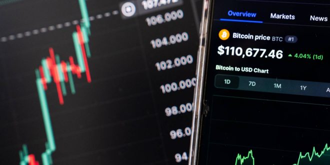 A photo illustration shows a chart of Bitcoin (BTC/USD) on May 22, 2025. The cryptocurrency Bitcoin (BTC) has crossed $110,000, reaching a new all-time high. (Photo by Manuel Romano/NurPhoto)NO USE FRANCE