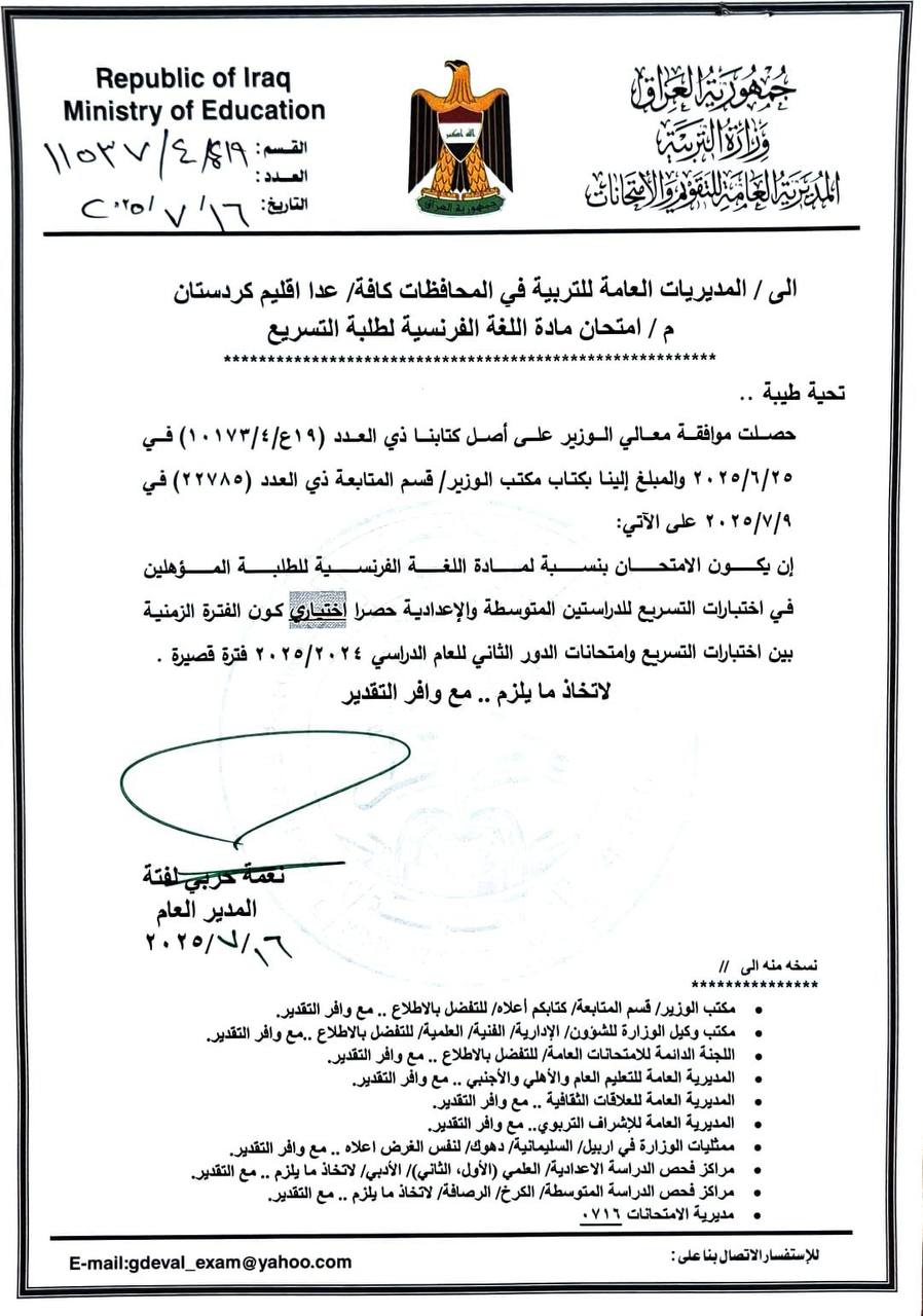 وذكر بيان للوزارة، تلقته (الغدير)، أنها “قررت جعل امتحان مادة اللغة الفرنسية اختيارياً للطلبة المؤهلين للمشاركة في اختبارات التسريع للمرحلتين المتوسطة والإعدادية”.