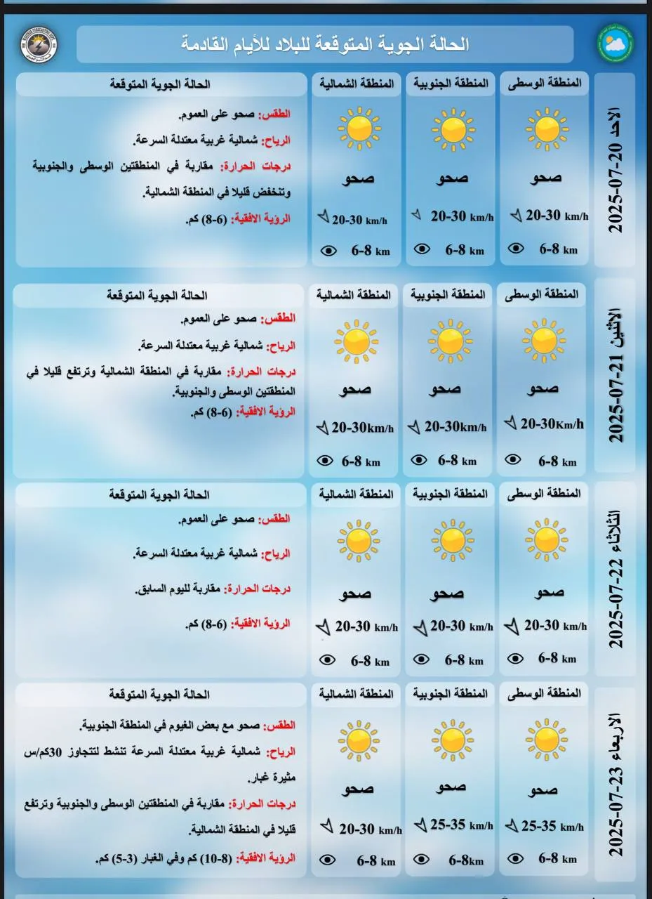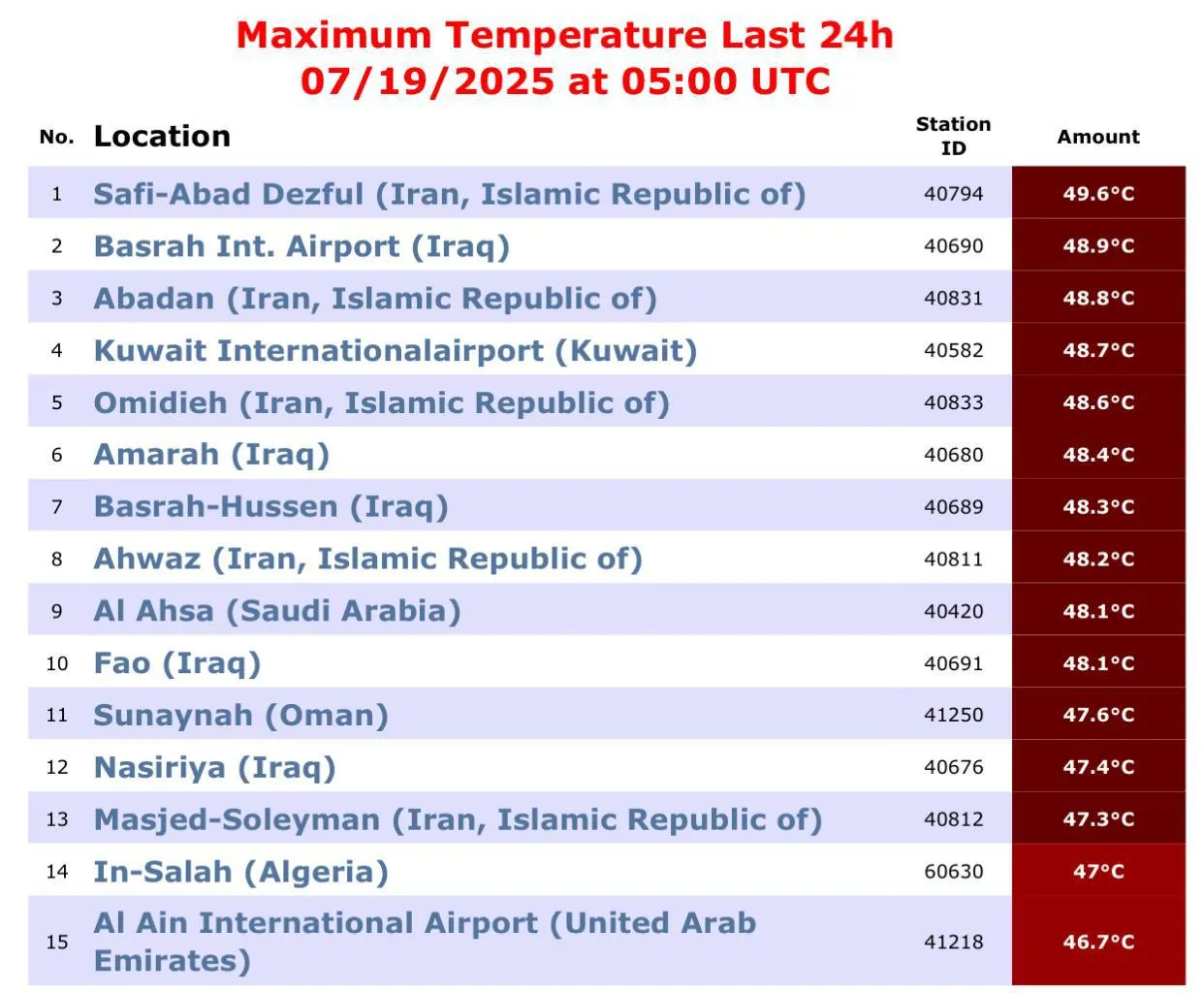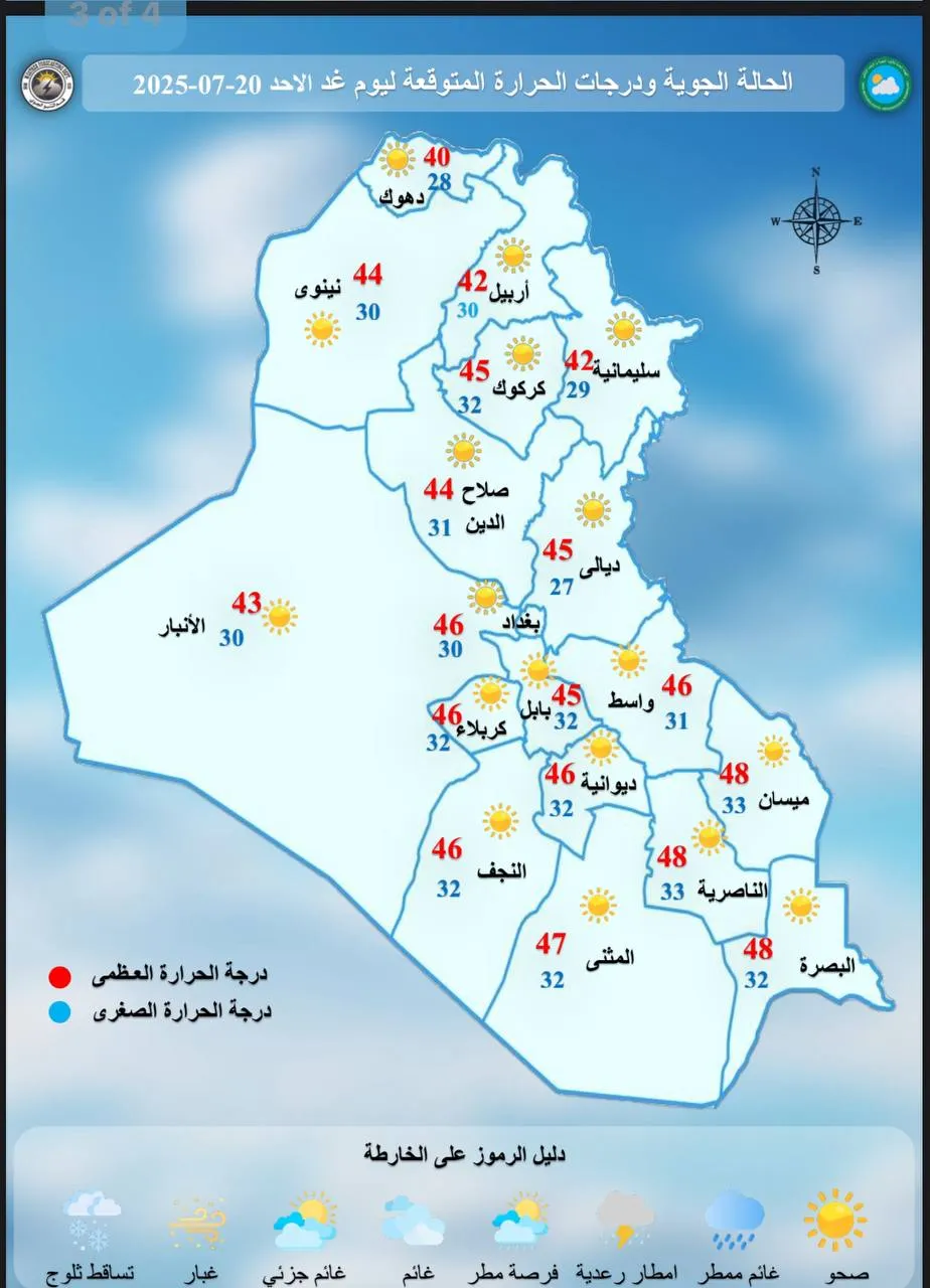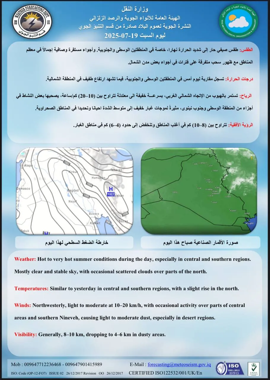 أعلنت هيئة الأنواء الجوية، اليوم السبت، حالة طقس العراق خلال الأيام المقبلة، فيما سجلت 5 مدن عراقية ضمن قائمة الأعلى حرارة بالعالم. شاركها Facebook Twitter Pinterest