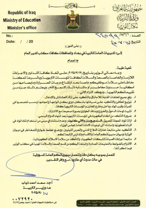 وجهت وزارة التربية، تعليمات فورية لمديرياتها والمؤسسات التربوية في عموم محافظات العراق باتخاذ كافة تدابير وإجراءات الصحة والسلامة، لاسيما مع ارتفاع درجات الحرارة وما يصاحبها من إمكانات حدوث حريق مفاجئ أو تماس كهربائي، عادة تطبيق توجيهاتها الثمانية في هذا الصدد جزءاً من التقييم الشهري لهذه المؤسسات.