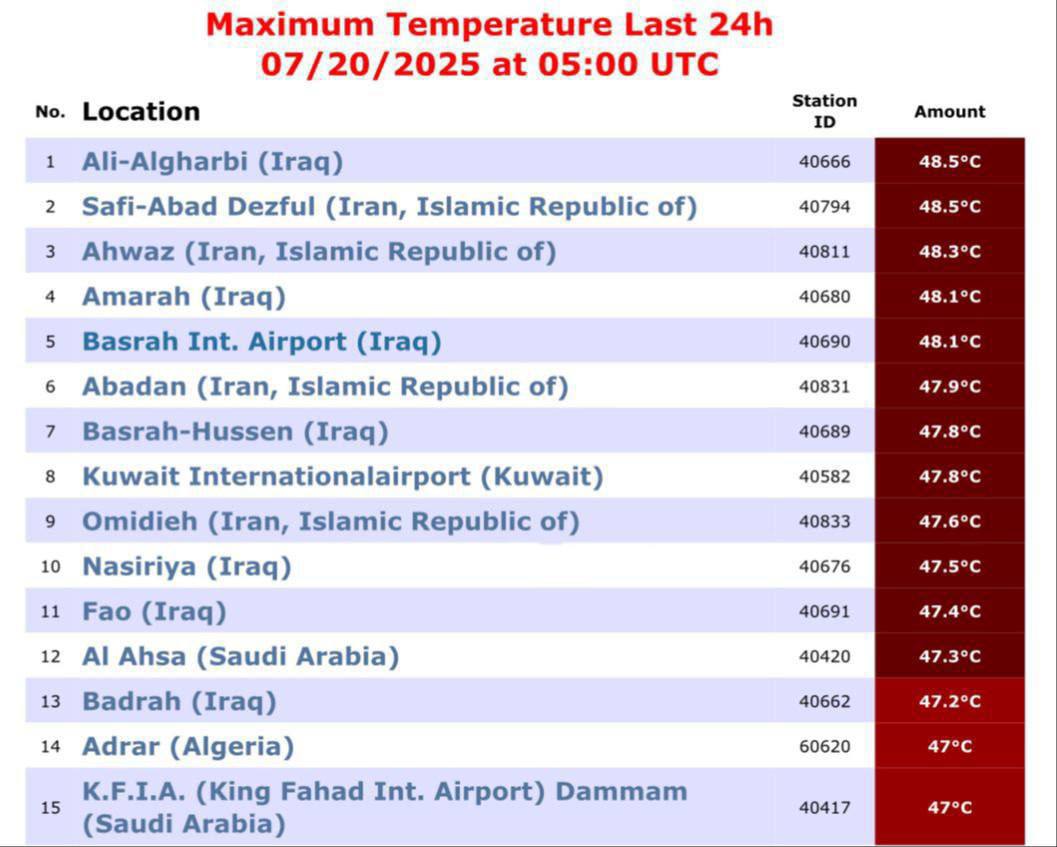 وبحسب وثيقة وردت إلى ( الغدير)، فإن “المدن العراقية، وعلى رأسها مدينة علي الغربي جنوب البلاد تصدرت لائحة الأعلى بدرجات الحرارة بدرجة 48.5 درجة سيليزية، اضافة الى مدن جنوبية اخرى مثل الناصرية التي حلت بالمركز الثالث”.