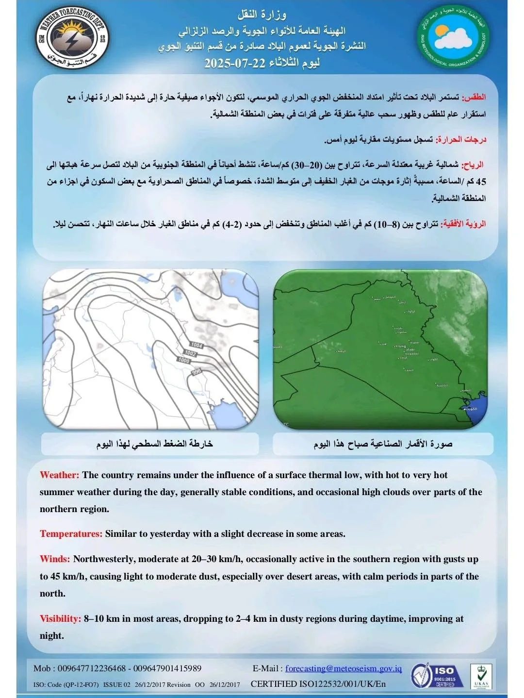 توقعت هيئة الأنواء الجوية، ارتفاع درجات الحرارة في العراق.