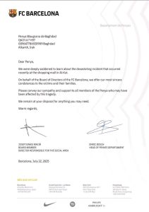 وقالت إدارة النادي، في رسالة وجهتها إلى رابطة مشجعي برشلونة في بغداد: “لقد حزنا بشدة لعلمنا بالحادث المأساوي الذي وقع مؤخراً في مجمع التسوق في الكوت“ .