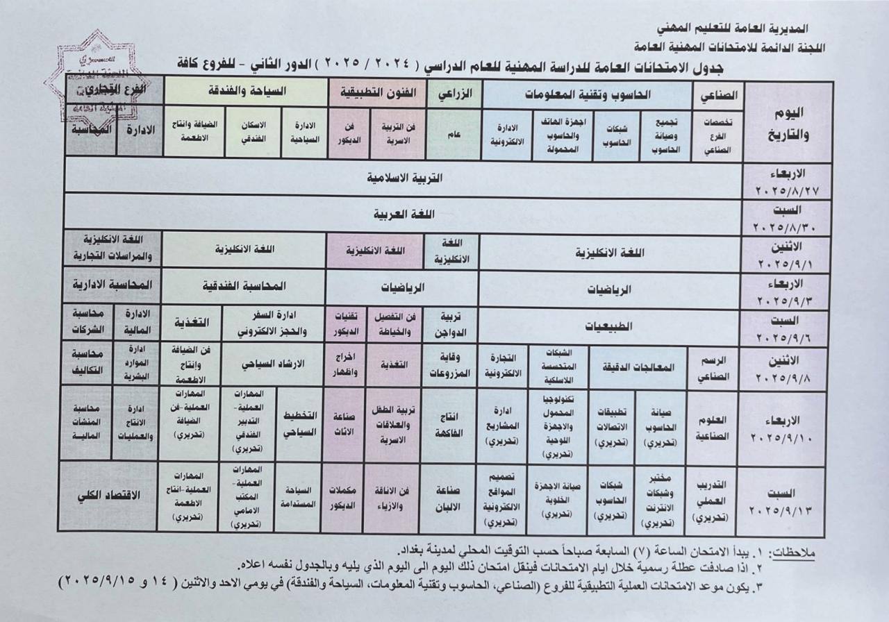 اعلنت وزارة التربية، اليوم الاحد، عن جدول الامتحانات المهنية العامة / الدور الثاني.