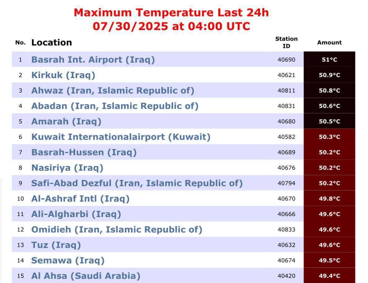 وتصدّر مطار البصرة الدولي في العراق القائمة عالميًا بدرجة حرارة بلغت 51.0 درجة مئوية، تلاه كركوك في العراق بـ50.9 درجة، ثم الأهواز في إيران بـ50.8 درجة، وعبادان في إيران بـ50.6 درجة، والعمارة في العراق بـ50.5 درجة.