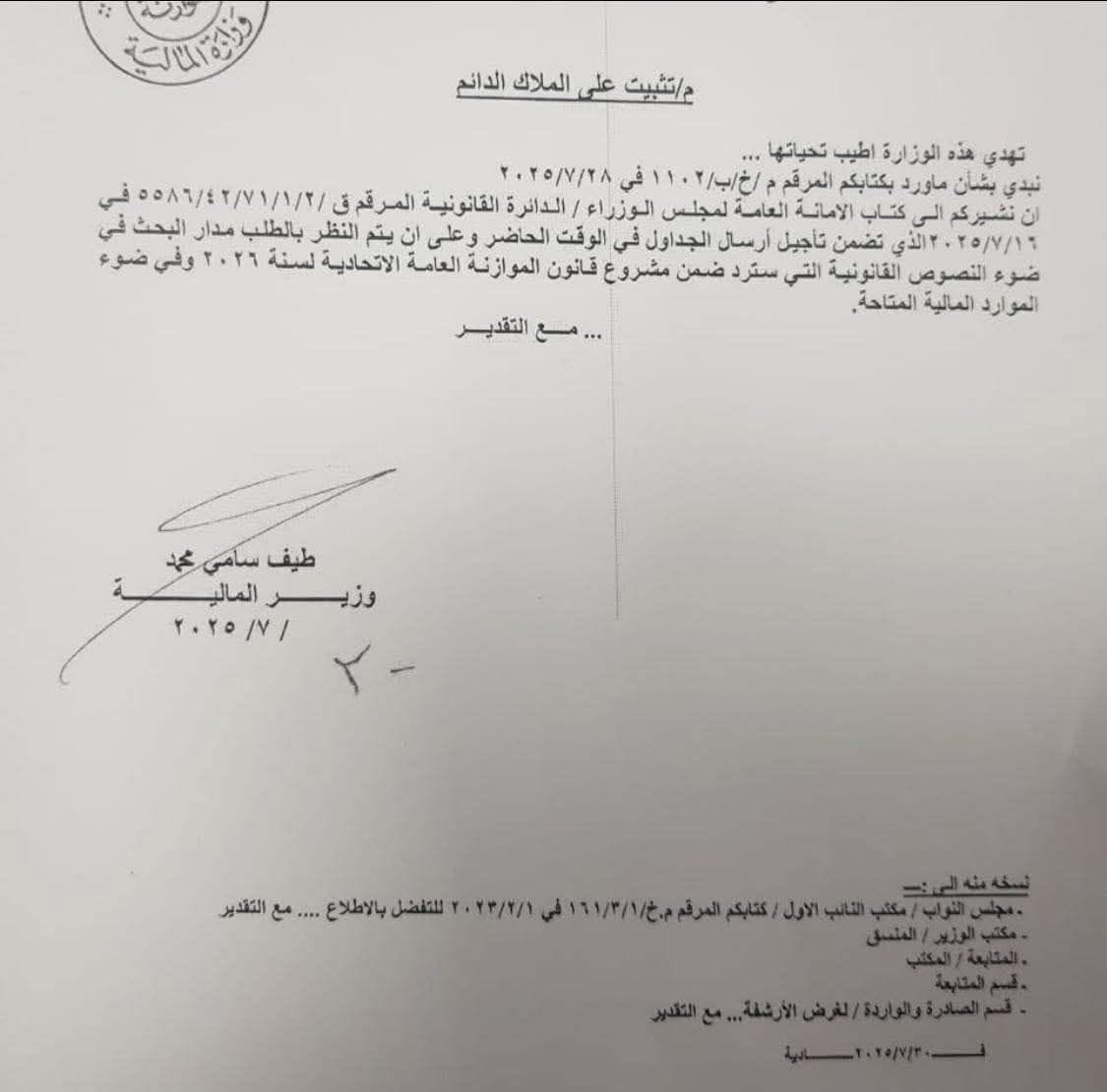 أكدت وزارة المالية، بكتاب رسمي موجه الى مجلس النواب، حصلت عليه ( الغدير)، تأجيل جداول تثبيت العقود على الملاك الدائم، لحين استكمال متطلبات موازنة 2026.
