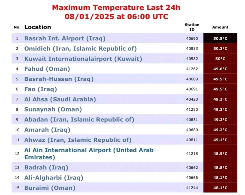 وبحسب مركز كاليفورنيا لمراقبة الطقس، تابعته ( الغدير)، فإن “مطار البصرة الدولي الواقع في محافظة البصرة جنوب البلاد احتل المرتبة الأولى في لائحة الدول الأعلى بدرجات الحرارة بدرجة 50.5 درجة سيليزية، بالإضافة إلى خمس مناطق أخرى.
