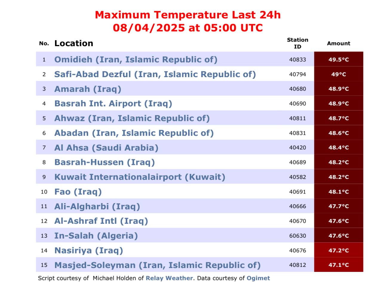 وأفادت محطة “بلاسيرفيل” في كاليفورنيا الأميركية، بأن جدولاً يضم 15 منطقة ومدينة حول العالم أظهر تصدر مدينة “عميدية” في إيران القائمة بدرجة حرارة بلغت 49.5 مئوية، تلتها “صفي آباد ديزفول” في إيران أيضاً بدرجة 49 مئوية.