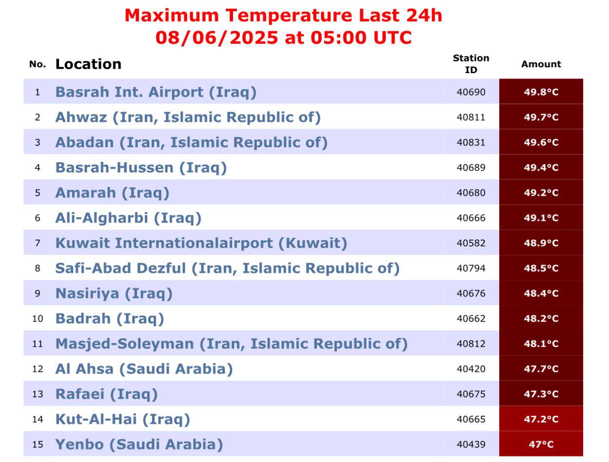 وشهدت منطقة حي الحسين في البصرة جنوبي العراق تسجيل 49.4 درجة مئوية، تلتها العمارة في العراق بـ49.2 درجة مئوية، ثم علي الغربي التي سجّلت 49.1 درجة مئوية، تليها مطار الكويت الدولي في الكويت بدرجة حرارة بلغت 48.9 مئوية.