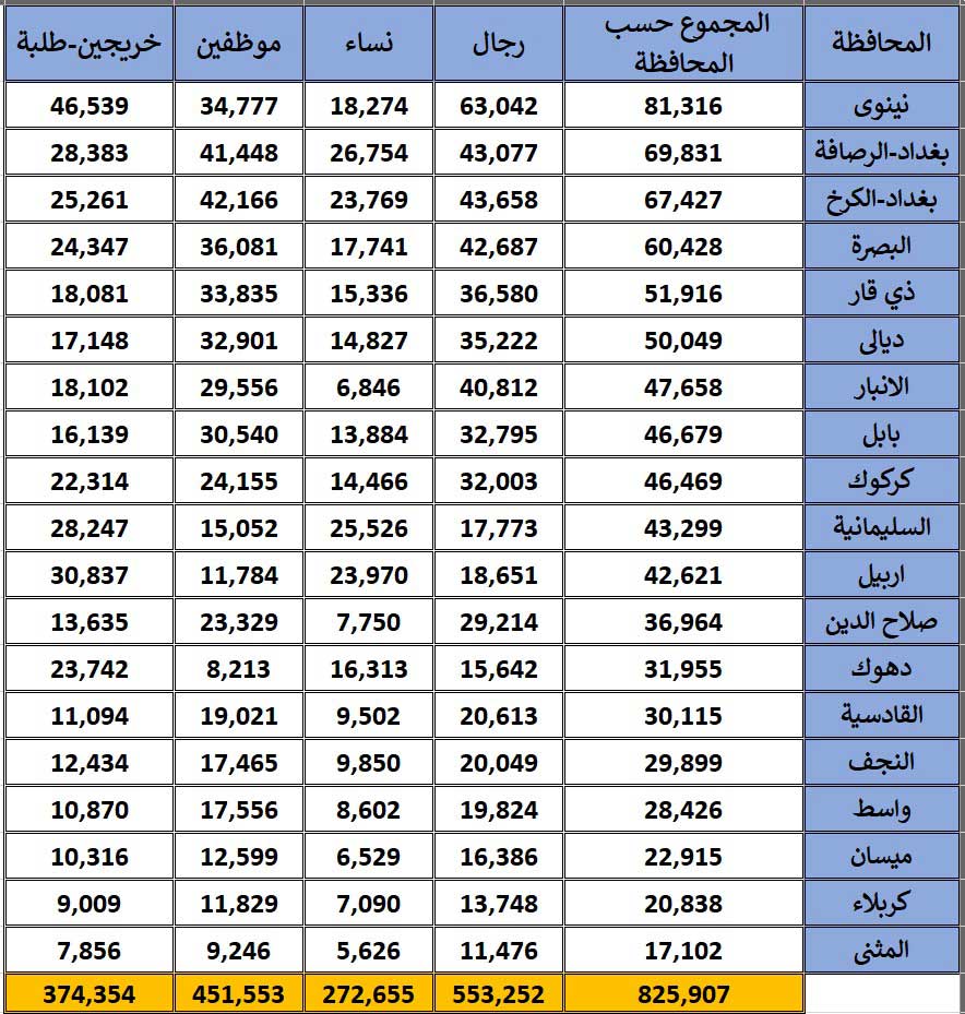 وأوضحت جمانة الغلاي المتحدثة باسم المفوضية في تصريح تابعته ( الغدير)، أنه”بحسب آخر إحصائية لدينا، فان عدد المتقدمين للعمل في مراكز الاقتراع بلغ 825 ألفا و907 شخصا، بينهم 553 ألفا و252 من الرجال و272 ألفا و655 من النساء، كما بلغ عدد المتقدمين من الموظفين 451 ألف و 553 موظفا، وعدد المتقدمين من الخريجين والطلبة 374 ألفا و354 متقدما”.