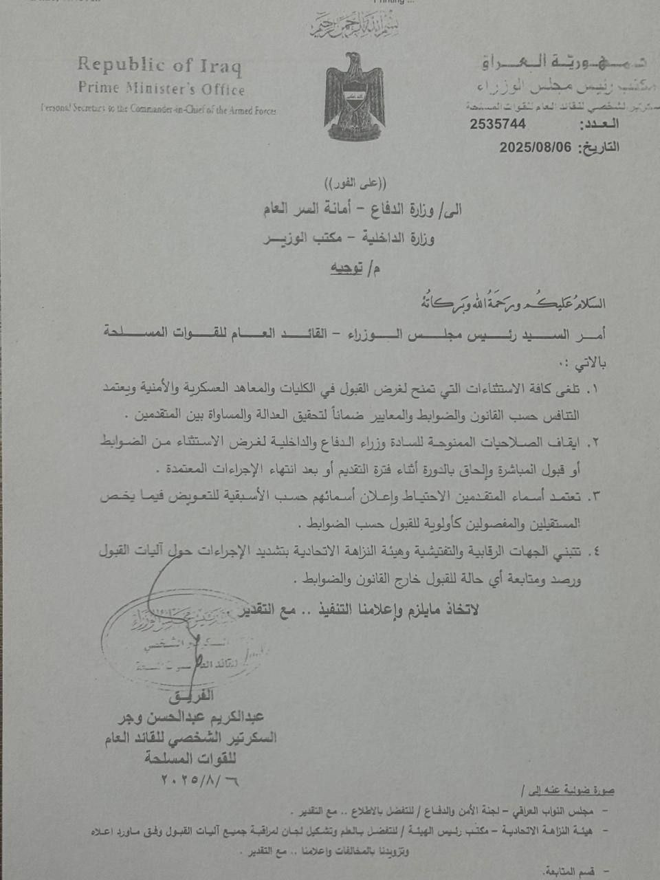 قرر رئيس مجلس الوزراء القائد العام للقوات المسلحة محمد شياع السوداني، الغاء استثناءات القبول في الكليات العسكرية، وإيقاف صلاحيات وزيري الدفاع والداخلية بهذا الصدد.