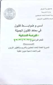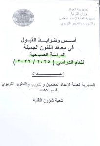 1 – يُسمح لجميع الطلبة التقديم إلى معاهد الفنون الجميلة (الدراسة المسائية) شرط أن يكون خريج الدراسة المتوسطة الاكاديمية أو المهنية أو ما يعادلها بموجب (معادلة شهادة) صادرة من وزارة التربية / المديرية العامة للتقويم والامتحانات بغض النظر عن المعدل والدور وسنة التخرج والعمر.