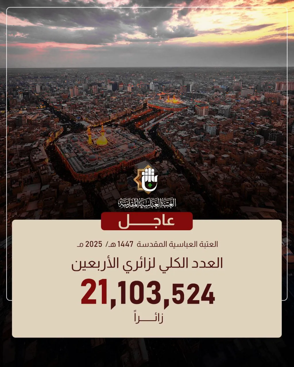 أعلنت العتبة العبّاسية المقدّسة، اليوم الجمعة، أن عدد المشاركين في إحياء زيارة الأربعين لعام 1447 هـ / 2025م بلغ (21,103,524) زائراً.