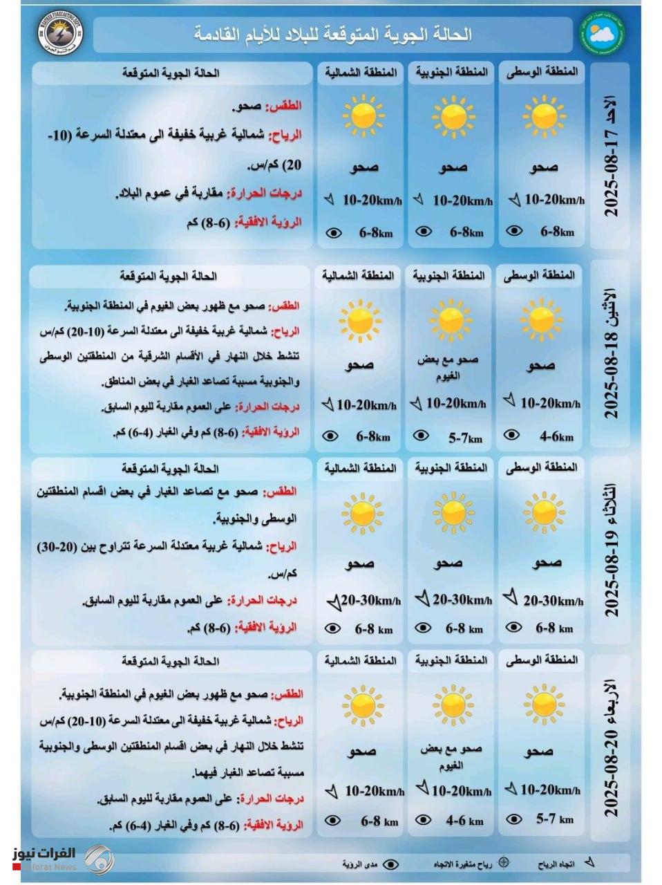 توقعت هيئة الأنواء الجوية، اليوم السبت، الحالة الجوية في البلاد للأيام المقبلة، مشيرةً إلى أن الطقس سيكون صحواً في عموم المناطق مع ظهور بعض الغيوم في المنطقة الجنوبية، فيما تنشط الرياح في المنطقتين الوسطى والجنوبية مسببةً تصاعد الغبار.