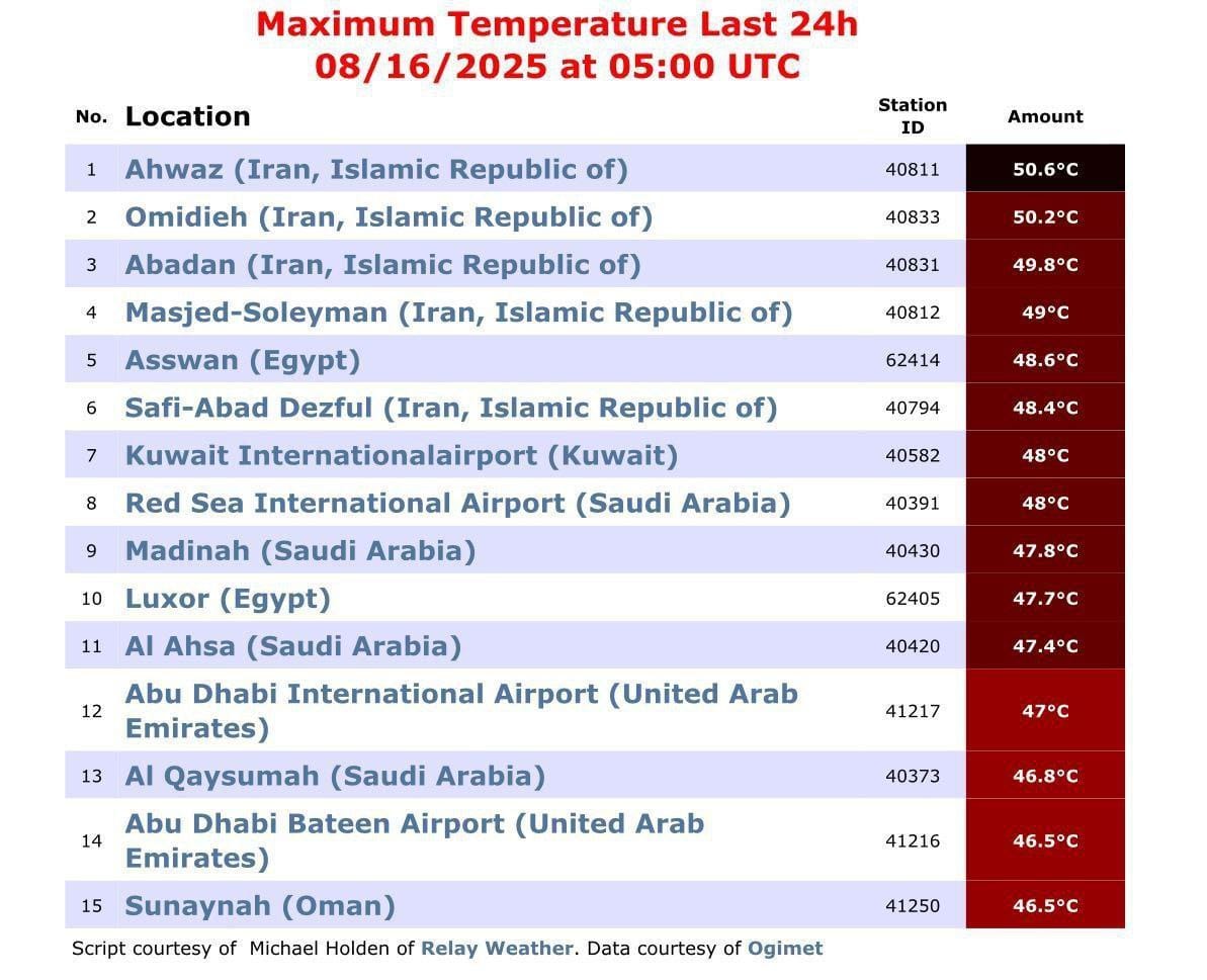 وبحسب جدول أصدرته محطة “بلاسيرفيل” في كاليفورنيا الأمريكية،، تصدّرت مدينة الأهواز في إيران المرتبة الأولى عالميًا بدرجة حرارة بلغت 50.6 مئوية، تلتها مدينة العميدية في إيران بدرجة 50.2 مئوية، فيما حلّت مدينة عبادان الإيرانية ثالثًا بدرجة حرارة 49.8 مئوية.